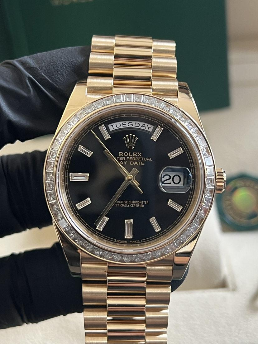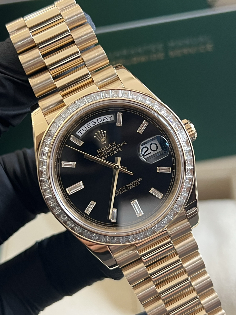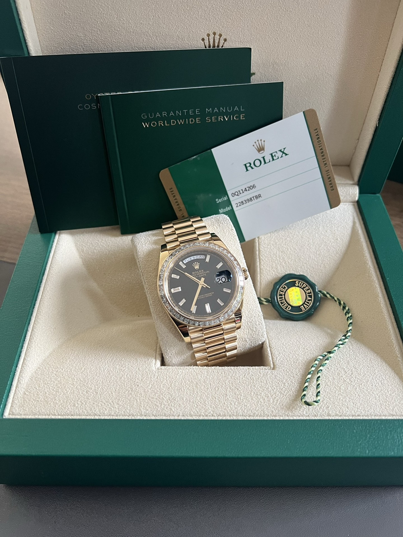 劳力士星期日历型系列型号: m228398tbr-0001男款18K黄金,全金钻刻T方圈钻黑冰糖,40毫米表径,全套附件如图,专柜公价:835200元