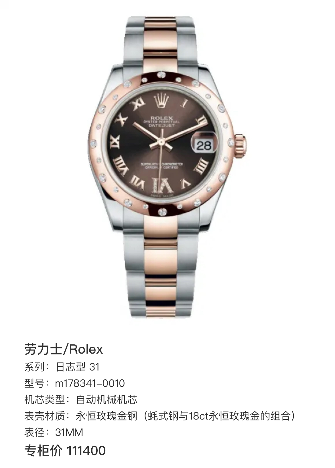 劳力士 日志型 m178341-0010 自动机械机芯 永恒玫瑰金钢(蚝式钢与18ct永恒玫瑰金的组合) 31mm表径 乱码表、吊牌 专柜价111400 现好价。