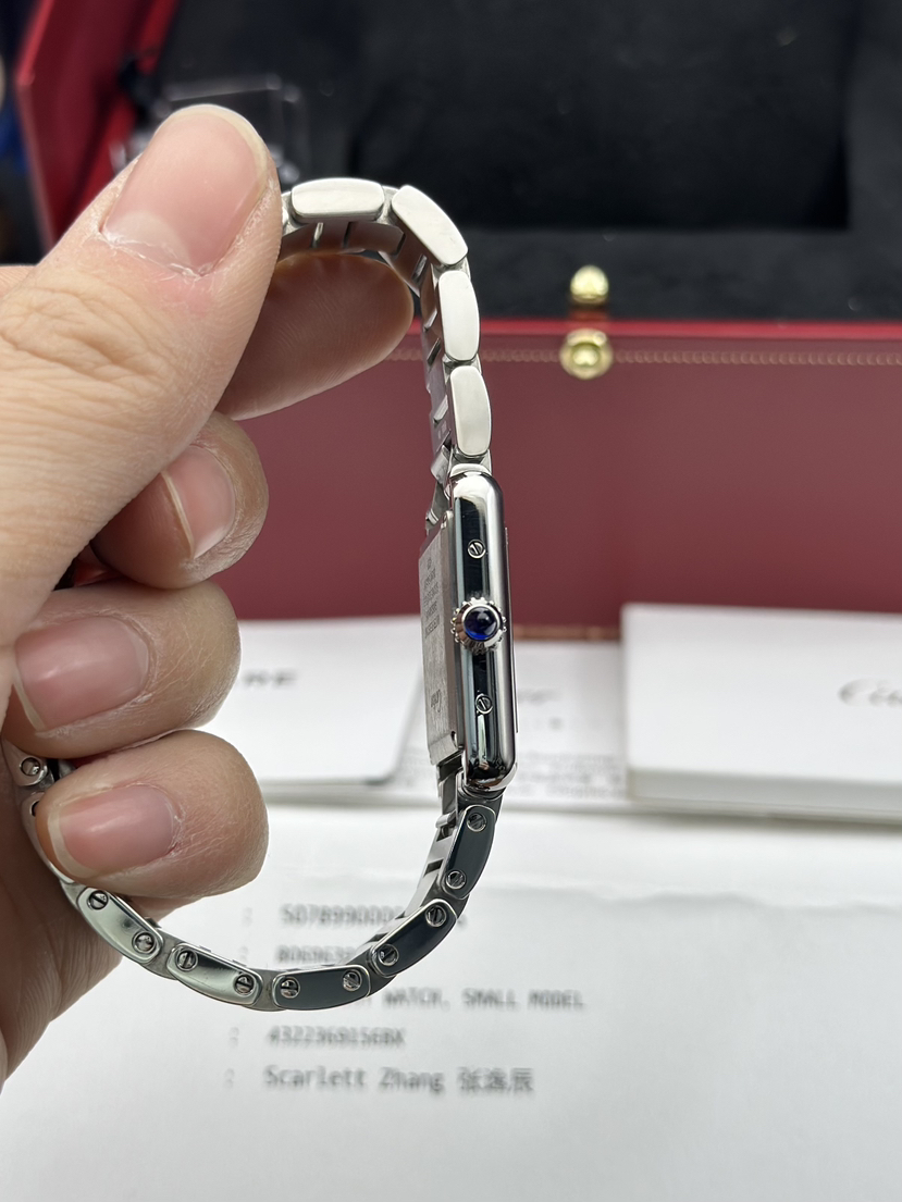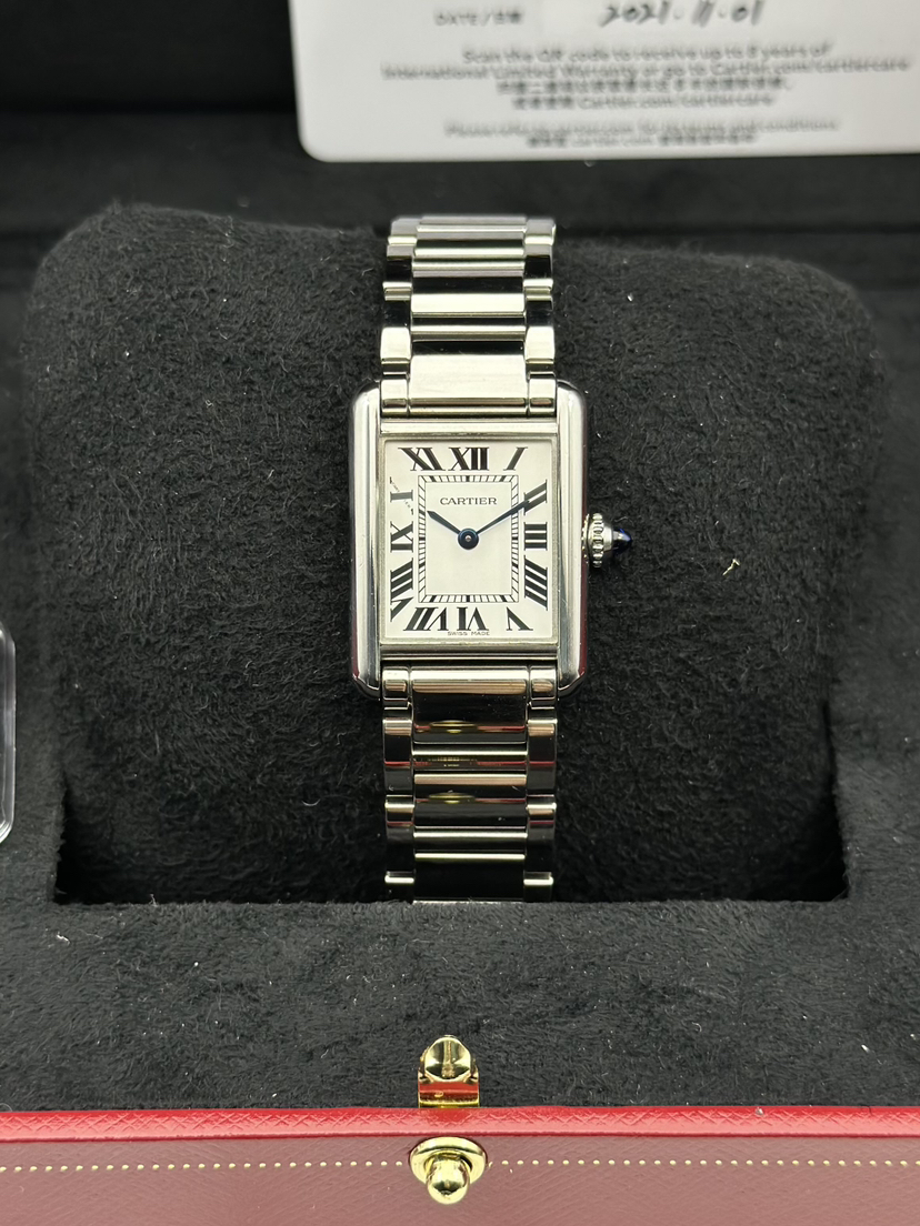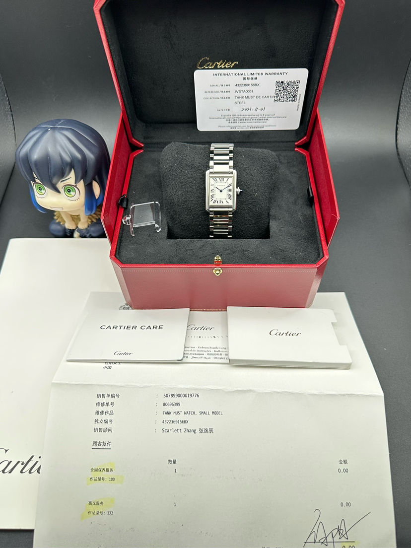 卡地亚/Cartier 坦克系列型号:WSTA0051 Tank Must腕表,小号表款 镶嵌1颗凸圆形合成尖晶石,镀银表盘,剑形蓝钢指针,2021年完美全套专柜延保至2029年 表壳尺寸:29.5毫米x22毫米 公价27800现货特价带走!。