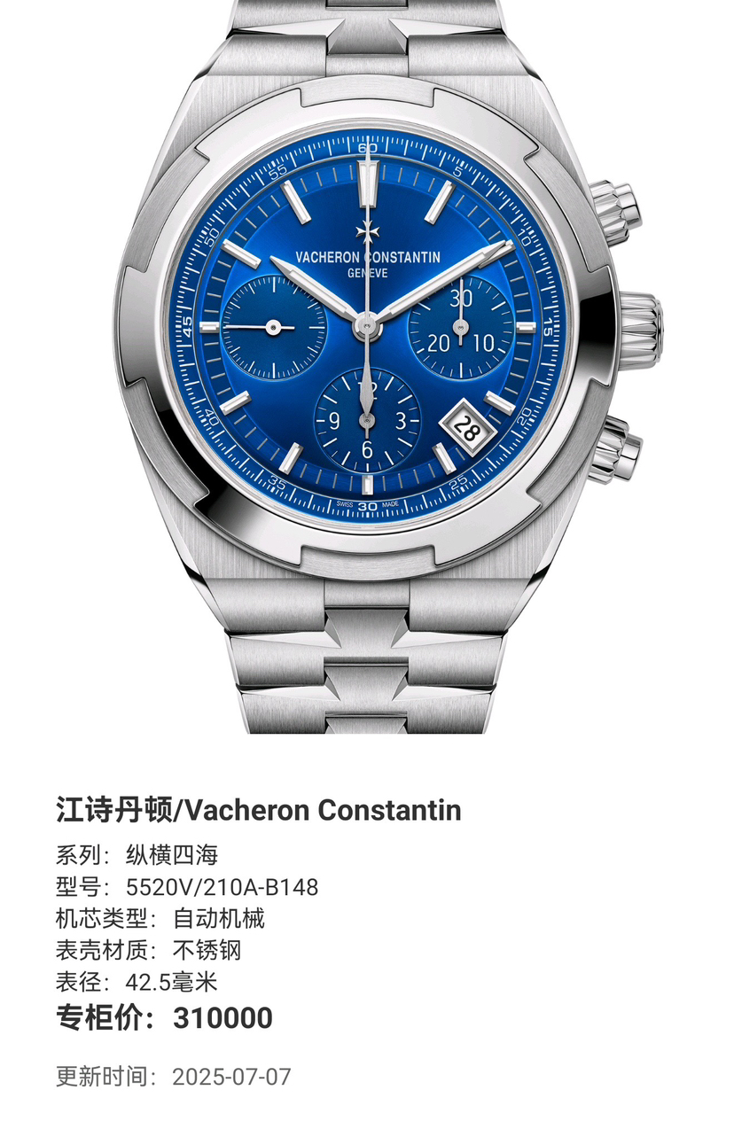 江诗丹顿 纵横四海系列 5520V/210A-B148蓝面 最帅蓝盘钢表 比5500v薄1.2毫米 新款表带 重量减少7克 新款更轻更薄 佩戴舒适感更好 专柜售价315000 店内现货25年12月卡全膜未使用 不超工价🉐。