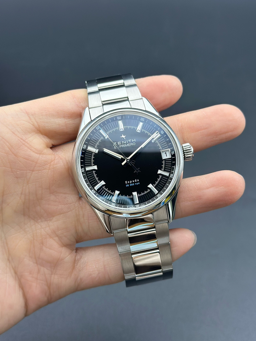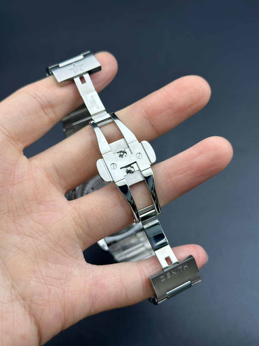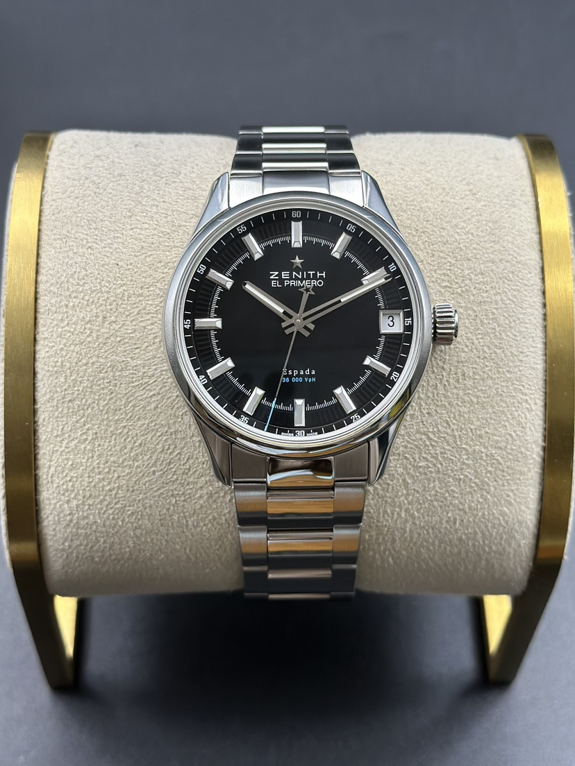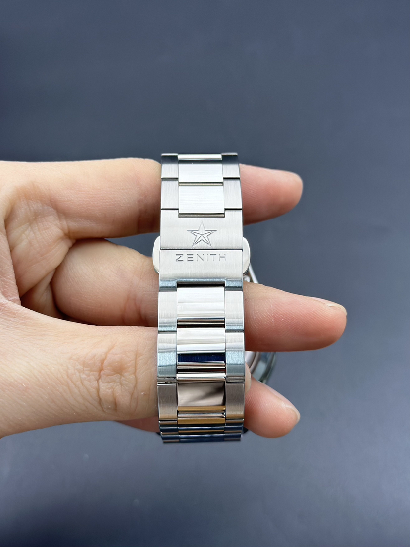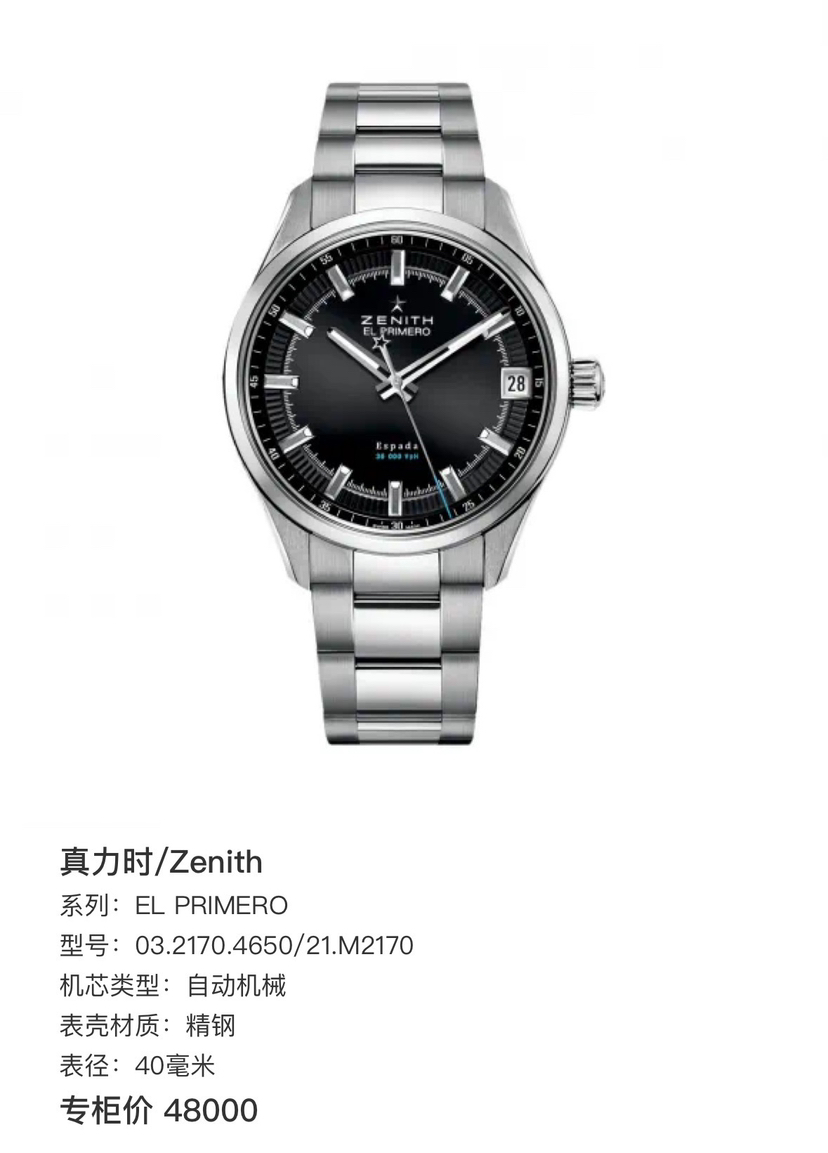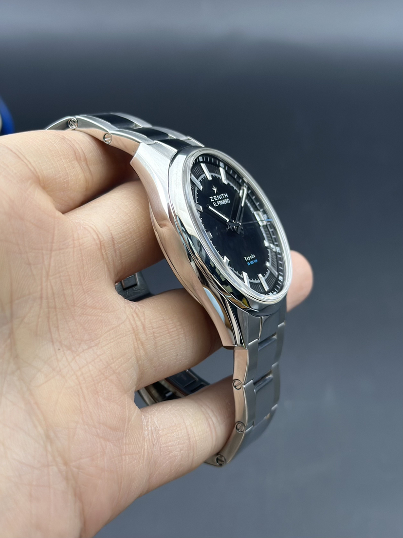 真力时(Zenith)EL PRIMERO系列03.2170.4650/21.M2170 男士自动机械腕表 全精钢材质 40mm表径 自动上链机芯 质感黑色盘面!日历显示 通勤表最好的选择 完美成色95新 公价48000元 现货特价带走!。