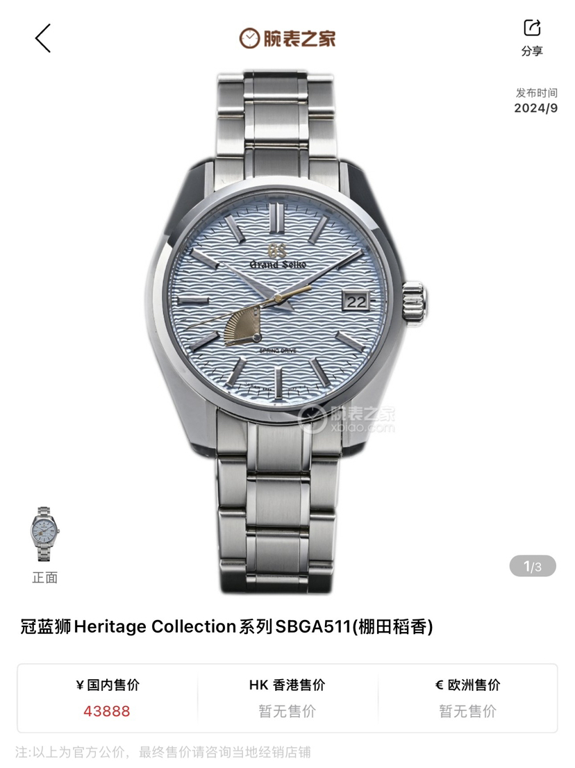 Springdrive混动机芯9R65/动储72小时/防水100米/表径40/44GS壳型/公价43888