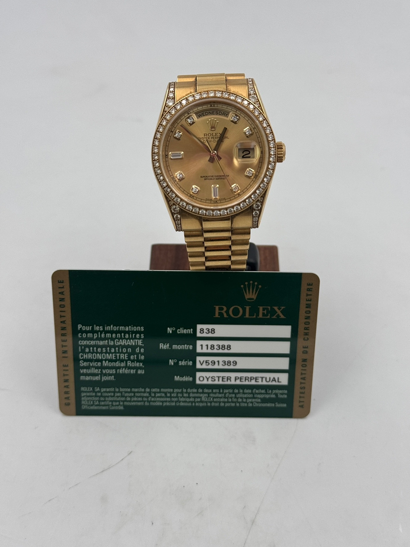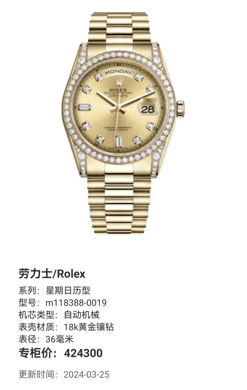 劳力士/Rolex 星期日历型 m118388-0019 自动机械 18k黄金镶钻 36毫米 2016年全套专柜价424300