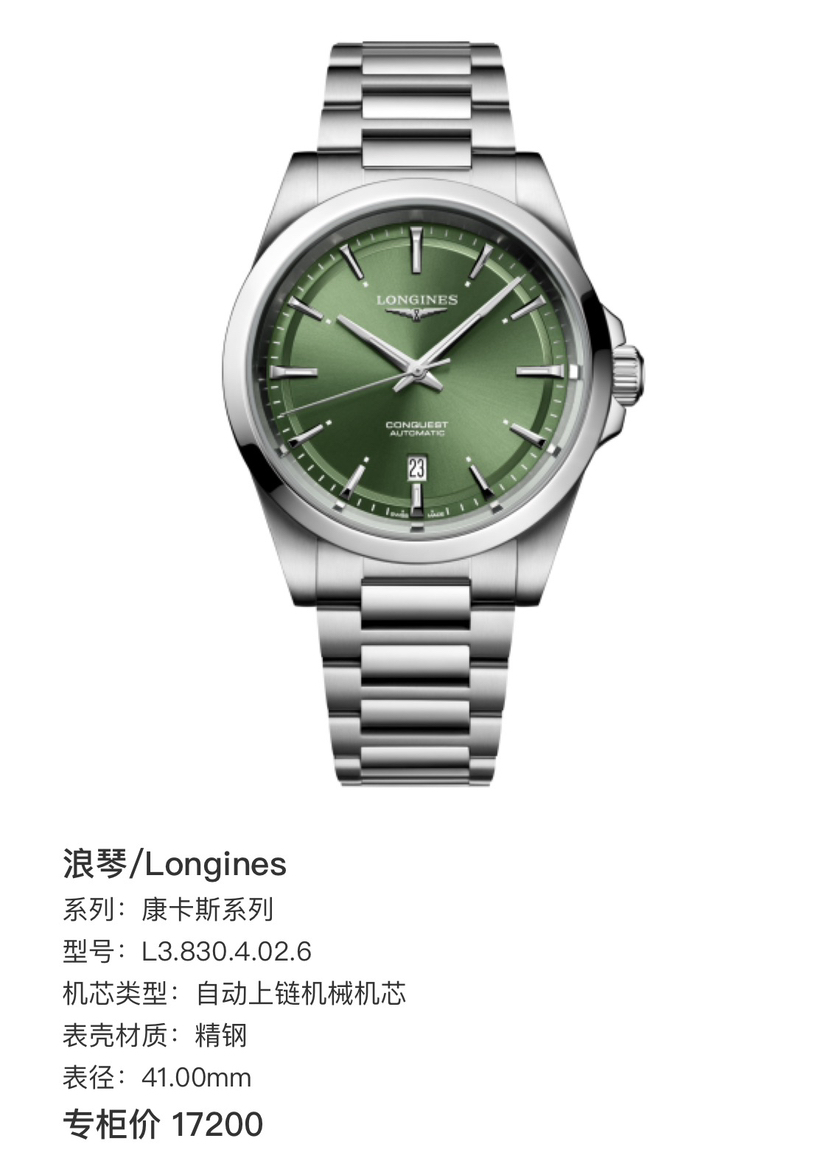 浪琴/Longines 康卡斯系列 L3.830.4.02.6 自动上链机械机芯 精钢 41.00mm 专柜价17200 附件 25年极品全套