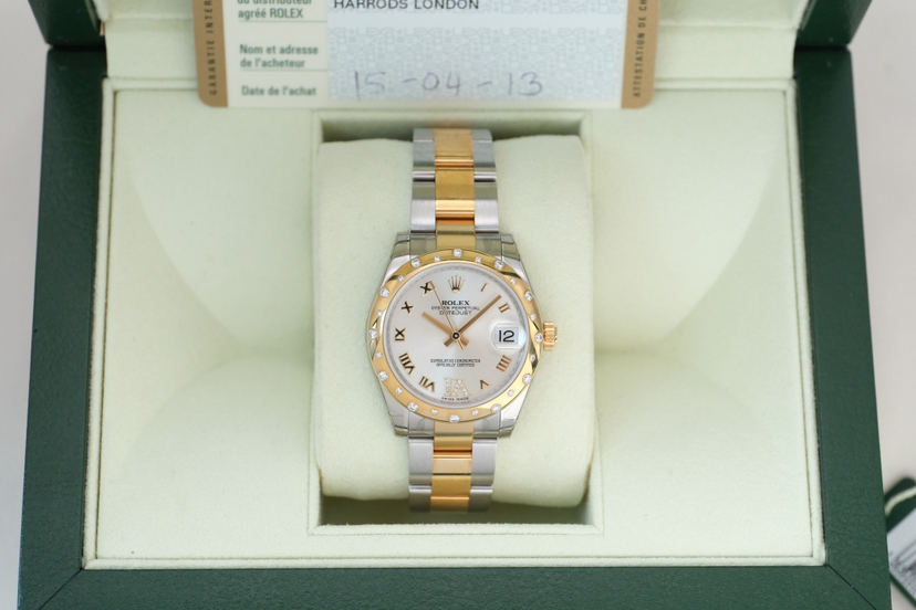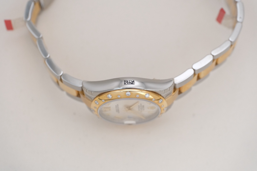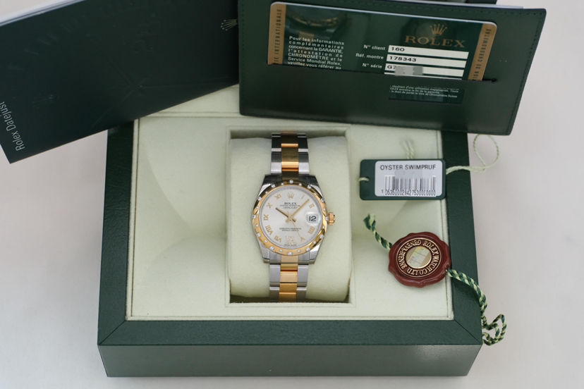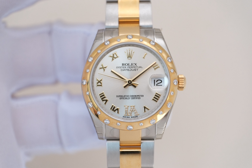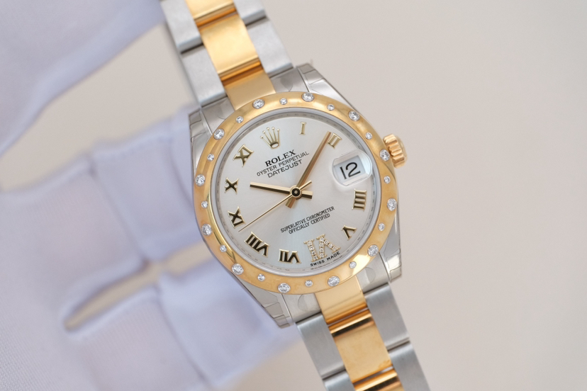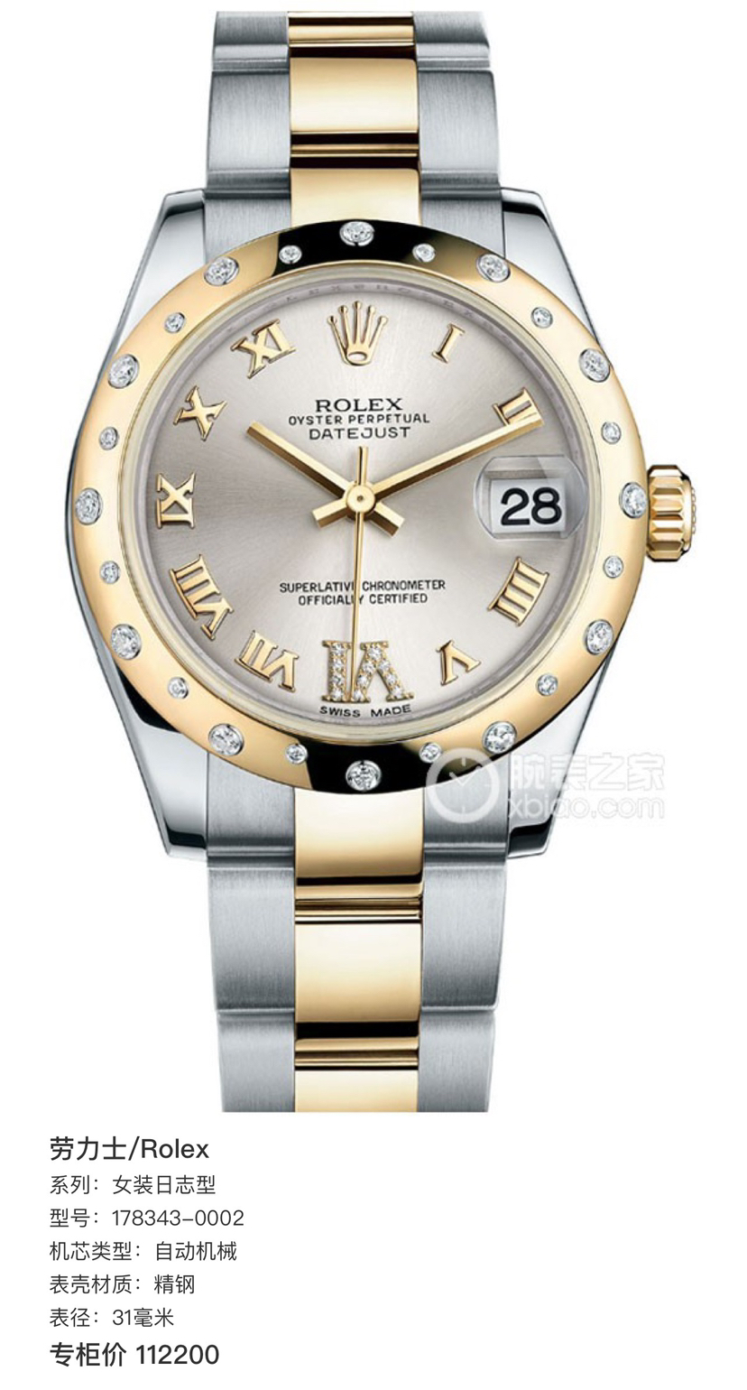 劳力士/Rolex 女装日志型 178343-0002 银灰罗马标6点位钻刻盘,表经31mm,自动机械,18K黄金间钢,2013年全套带票/闲置全膜未使用品,专柜价112200