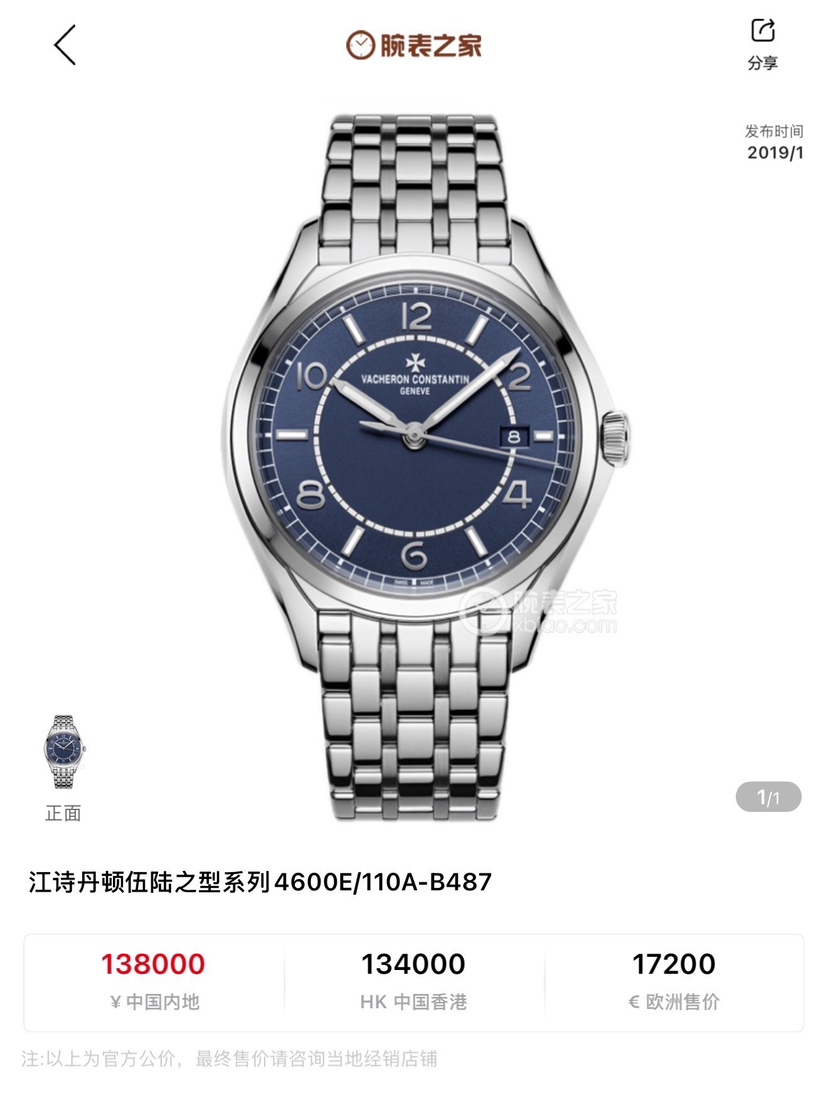 江诗丹顿 伍陆之型4600E/110A-B487 蓝盘钢带款,专柜价138000。 2024年10月国行二手全套全长,原始成色。