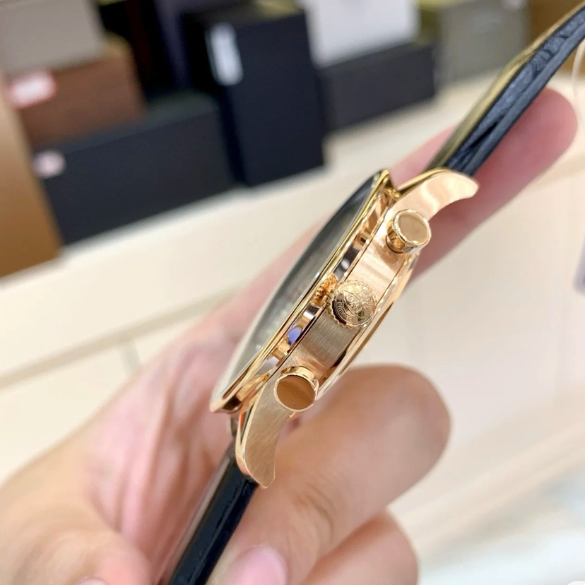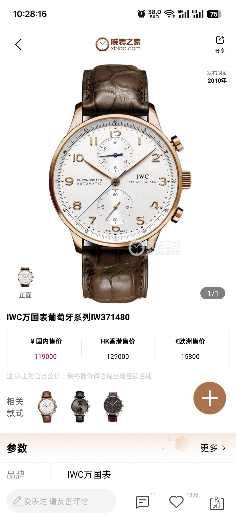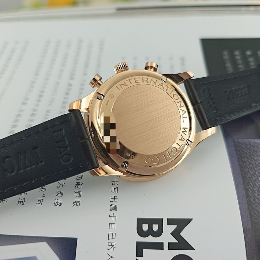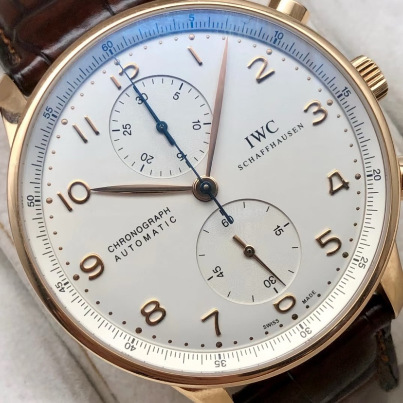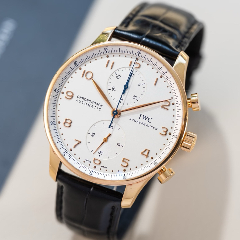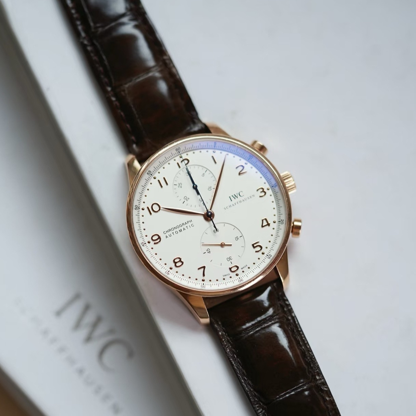 万国葡萄牙系列男表,型号:IW371480,18k玫瑰金材质表壳搭配鳄鱼皮表带,41mm白色圆形表盘,自动机械机芯,计时功能。公价¥119000,现货好价可得。