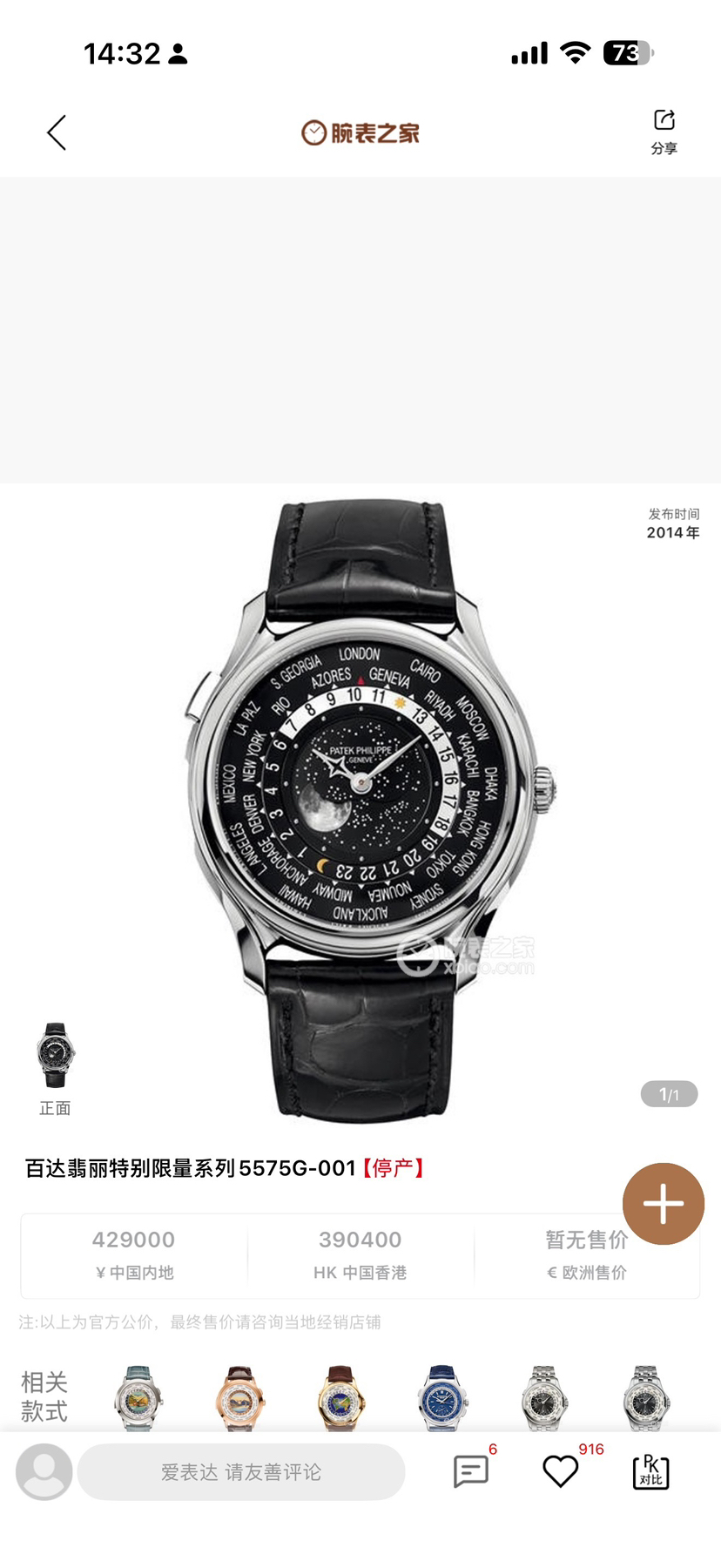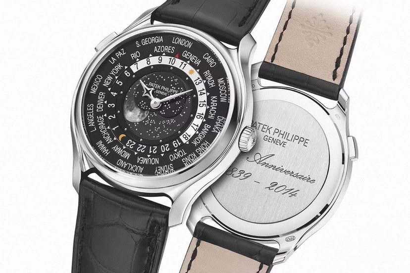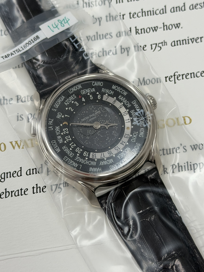 5575G为庆祝品牌创立175周年而发行的1300枚纪念版手表。24小时制日夜显示,世界时间功能,黑色星空真月相表面,内圈有立体白金圆点时标,中圈有24小时制可转动日夜显示,黑色可转动外圈印有24个不同城市时区名字,表身10时位置设有方形按钮,可将须要时间显示的时区城市转动至12时位置。蓝宝石水晶镜面,白金密底盖刻有百达翡丽成立175周年纪念字句,表径39.8mm