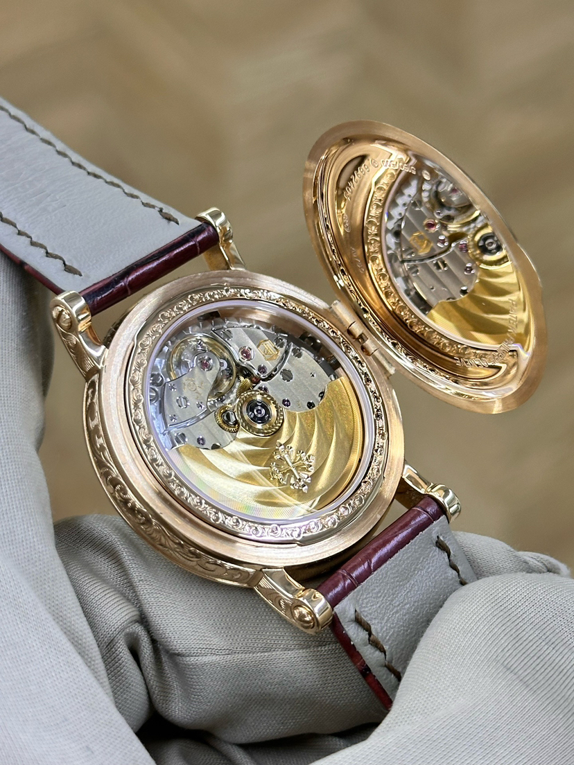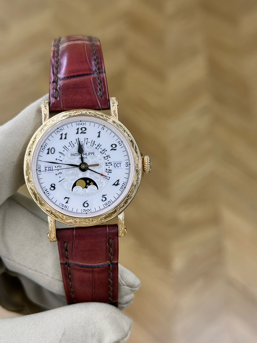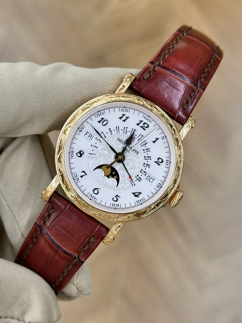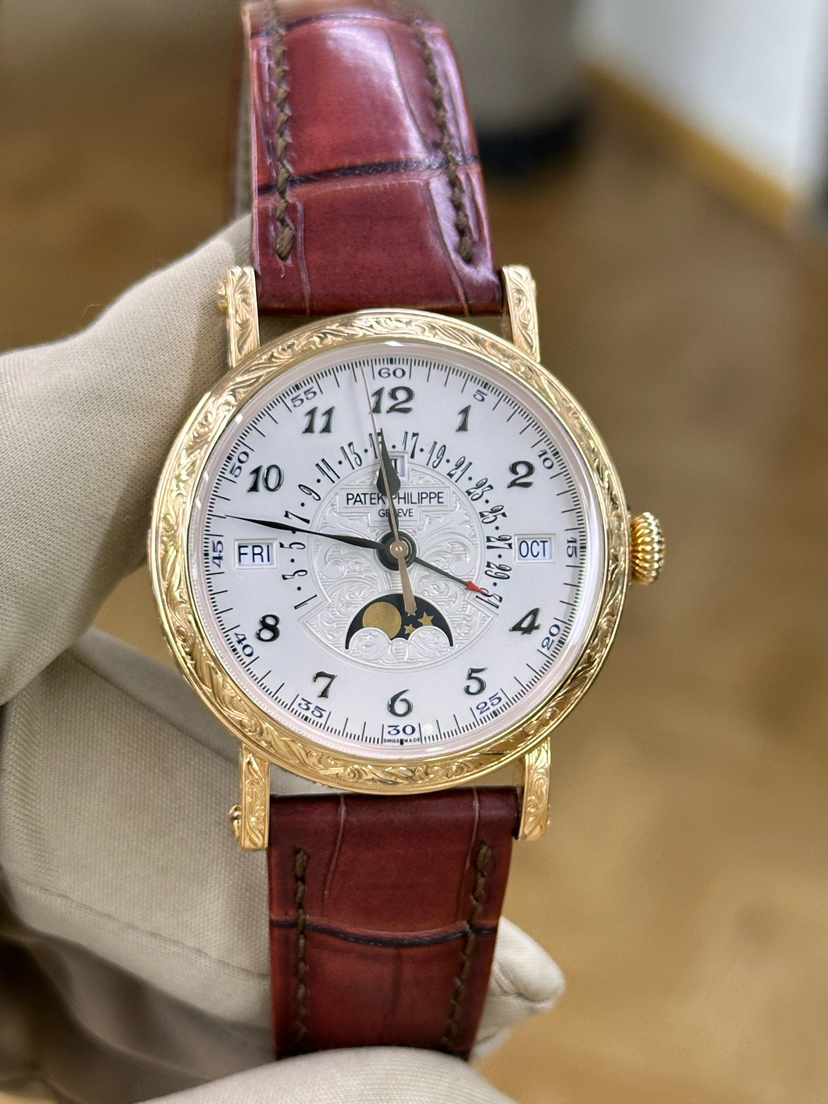 百达翡丽,超级复杂功能时计系列雕花腕表 5160/500R 38mm表径,玫瑰金表壳,集万年历和月相功能于一身,精美绝伦的雕花工艺和自动机械机芯,绝对值得收藏的经典款,适合每一个钟表爱好者;专柜价209.4万,24年7月全套,现货好价!