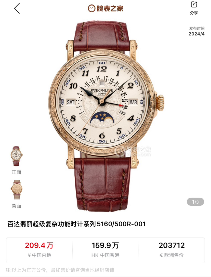 百达翡丽超级复杂功能计时腕表5160/500R-001机械男性