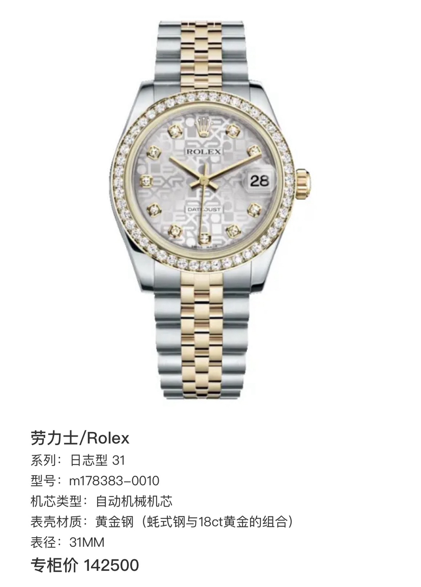 劳力士 日志型 m178383-0010 自动机械机芯 黄金钢(蚝式钢与18ct黄金的组合) 31mm表径 专柜价142500 单表好价。