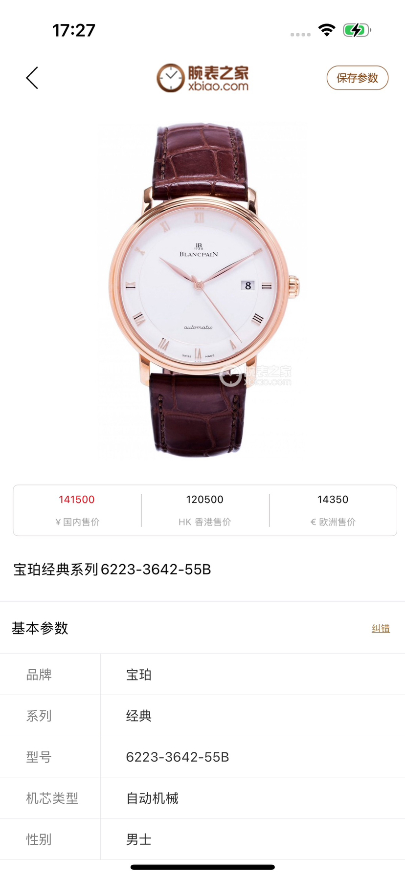 宝珀经典系列6223-3642-55 男士自动机械腕表,18k玫瑰金材质,表径38mm,动力储备100个小时,日期显示 公价141500,现货特价