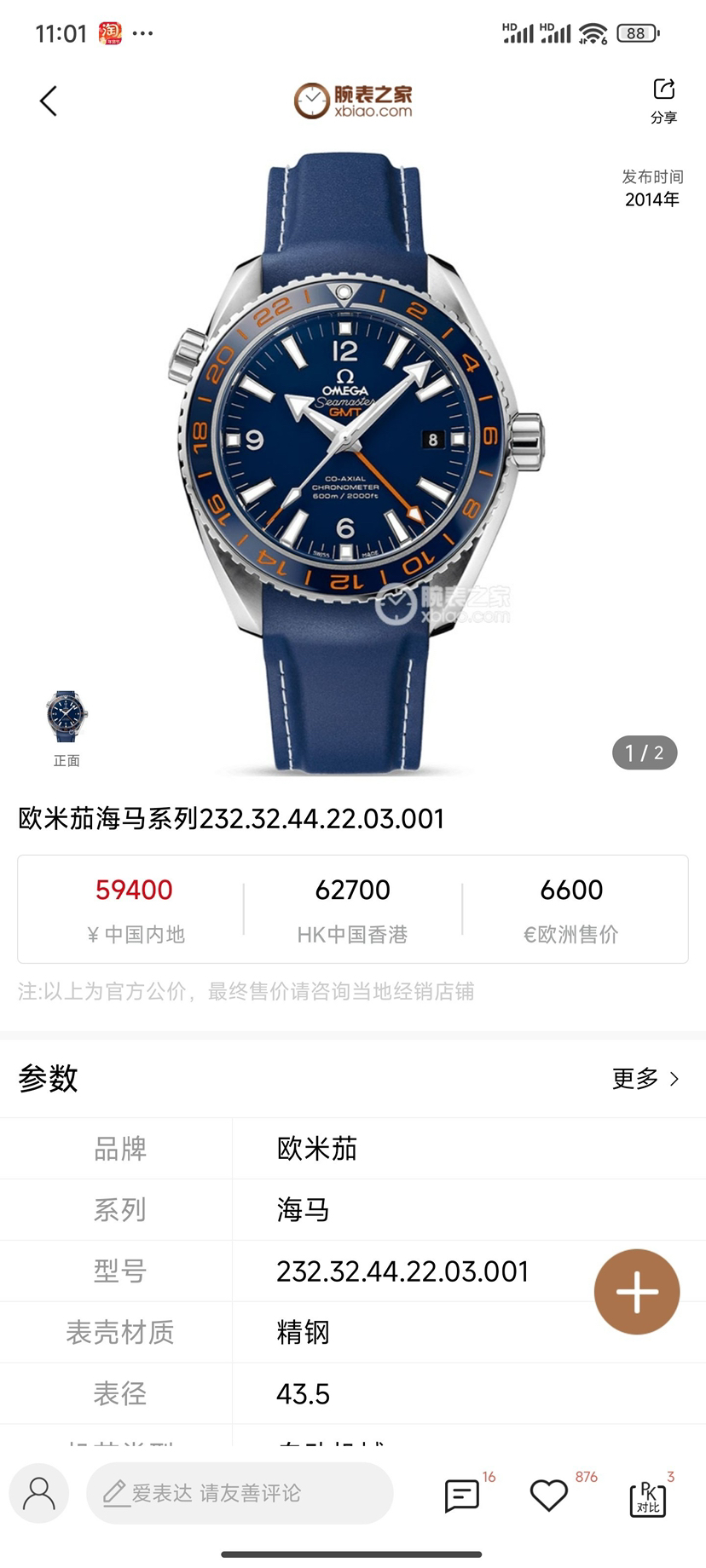 欧米茄海马232.32.44.22.03.001机械男性