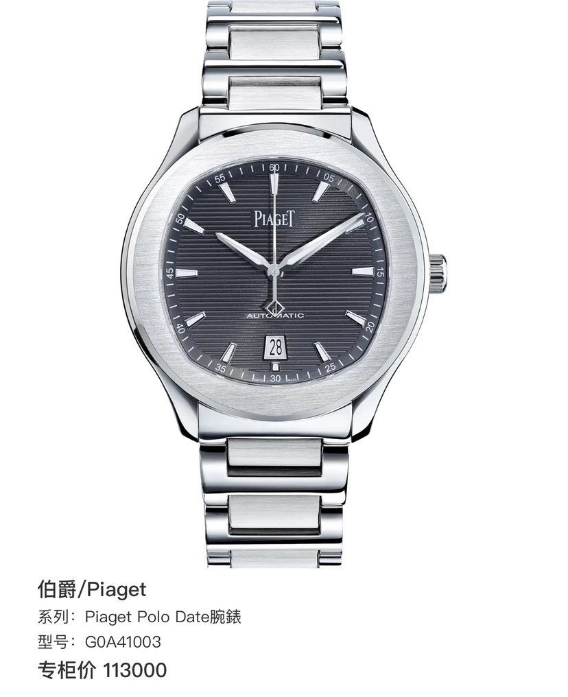 伯爵POLO系列G0A41003、自动机械、精钢表壳表带、灰盘、42mm、专柜价113000,现在单表好价