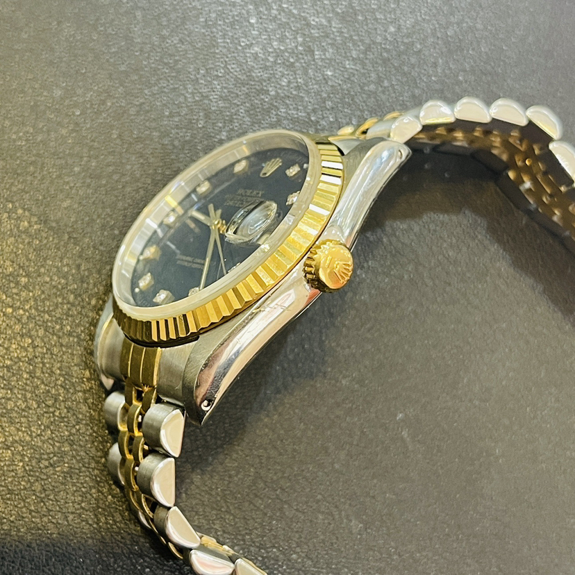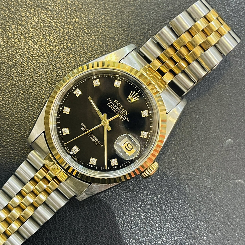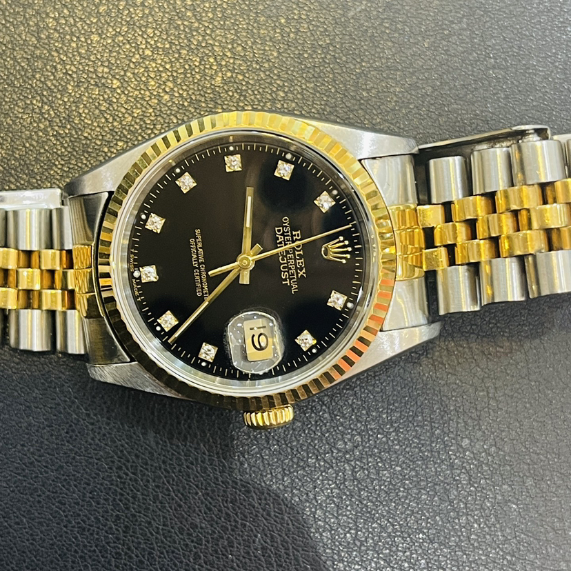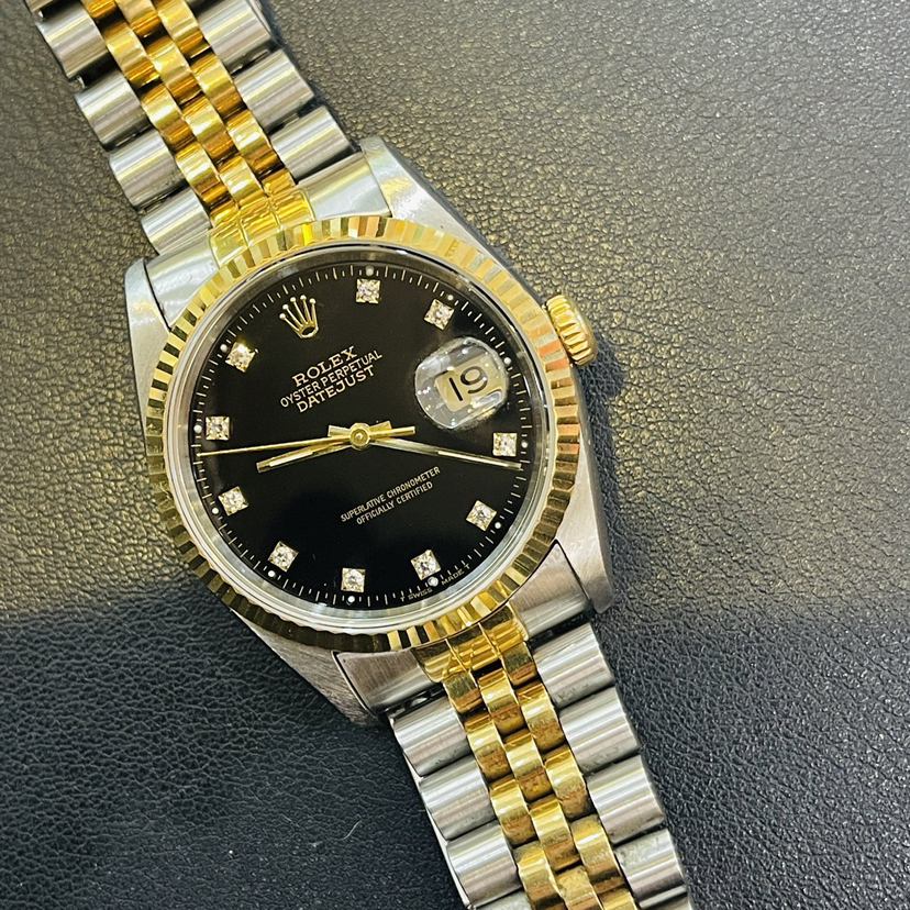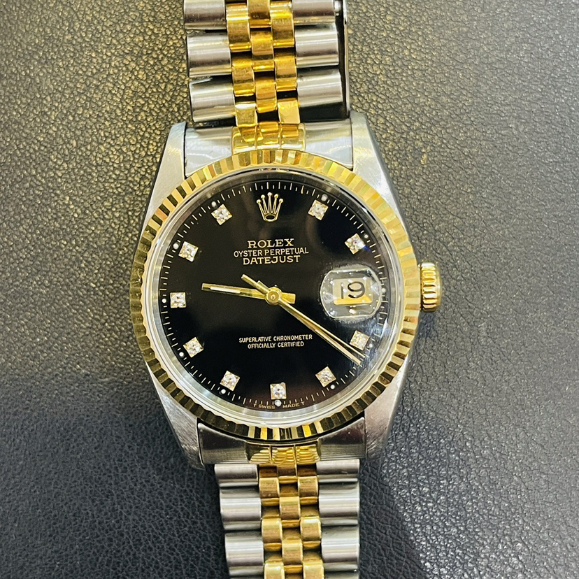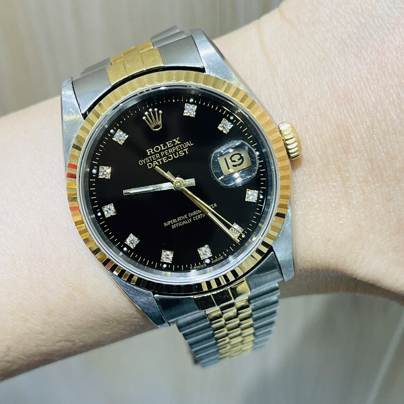 劳力士日志系列16233原盘原钻黑盘,36mm表径,3135自动机芯,18k黄金 精钢,功能日期显示,黑金搭配永不过时的搭配,上手时尚大气。单表 有店内现货