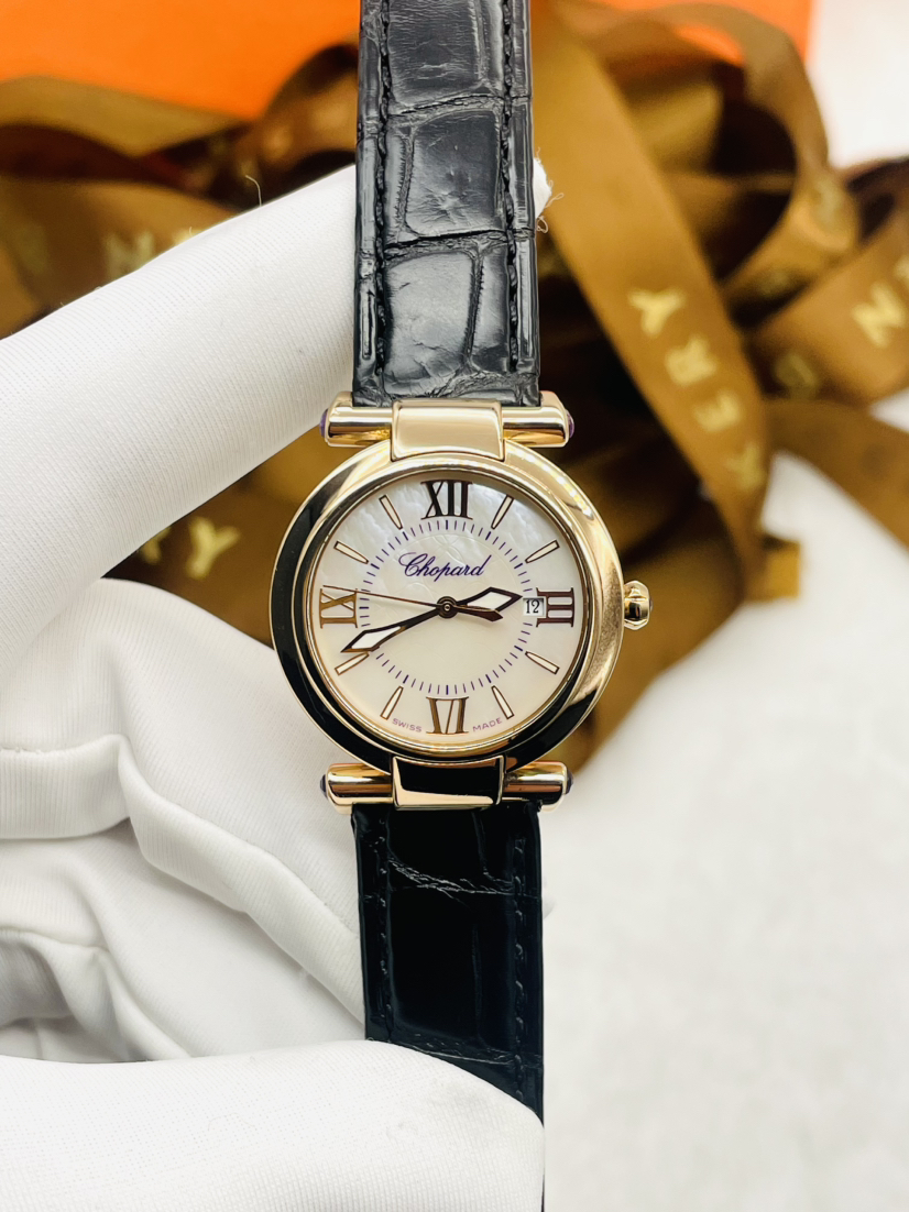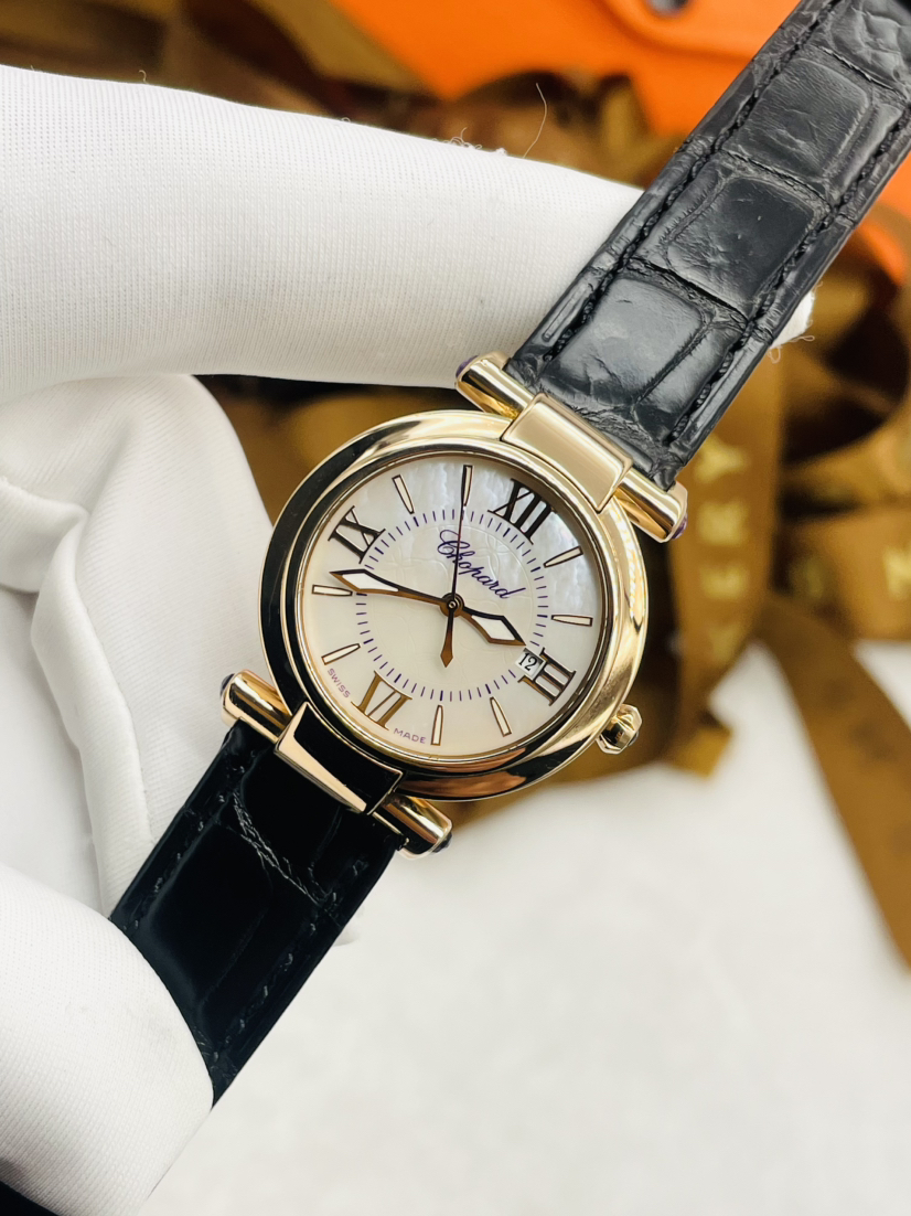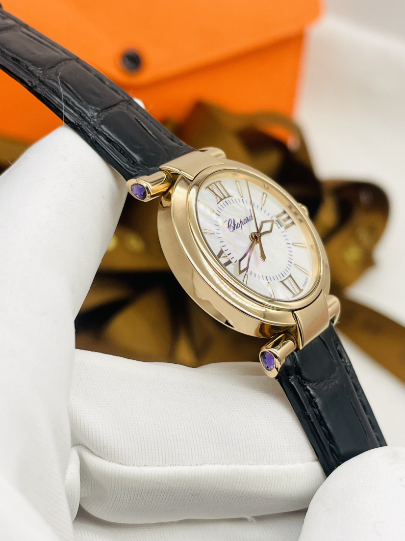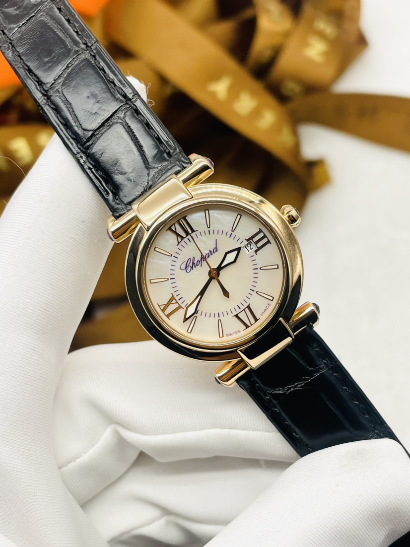 萧邦IMPERIALE系列18k玫瑰金贝母盘石英女表
