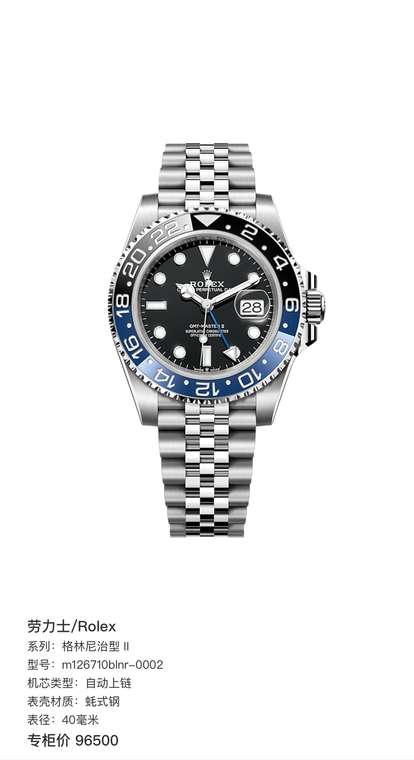 劳力士 格林尼治型 II m126710blnr-0002 自动上链 蚝式钢 40mm表径 专柜价96500 单表好价。