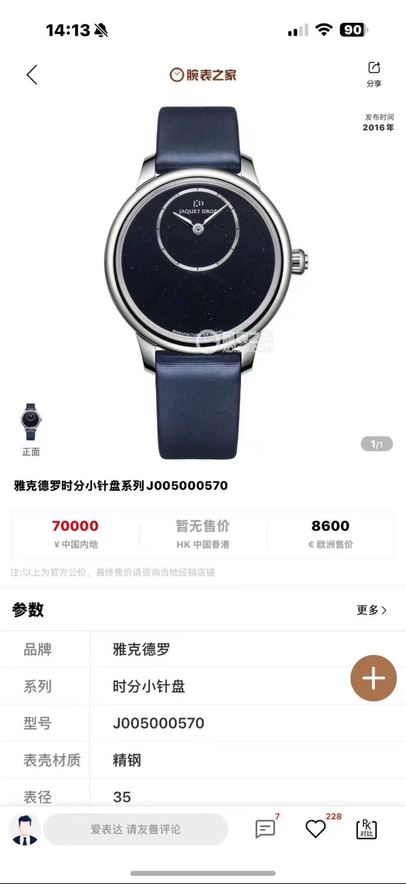 雅克德罗-女装表:J005000570,35MM表径精钢表壳和表扣,自动机械机芯,沙金石表盘,未使用品全套附件齐全,公价7万,特价