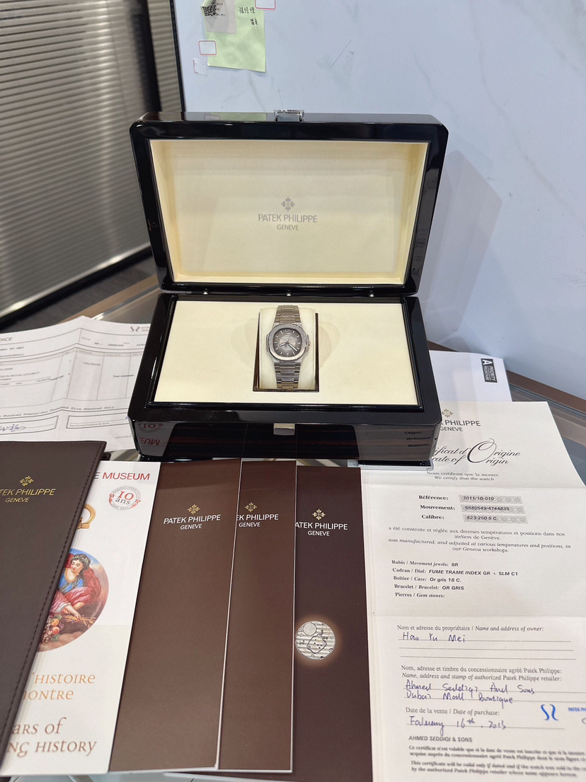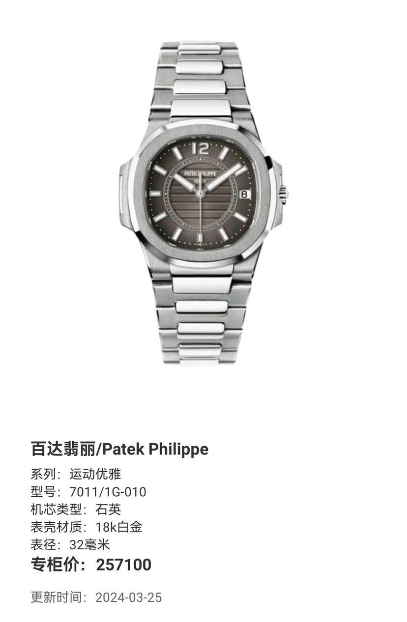 百达翡丽/Patek Philippe 运动优雅 7011/1G-010 石英 18k白金 32毫米 专柜价257100,13年全套全长