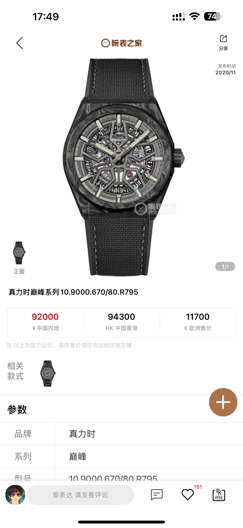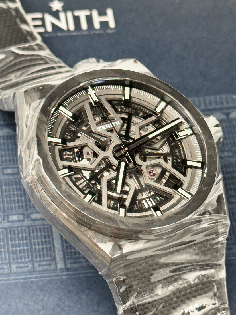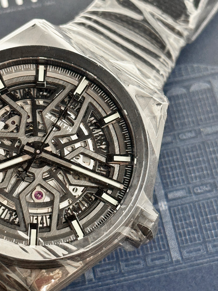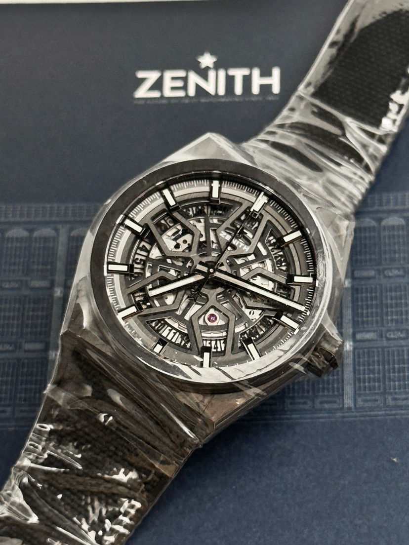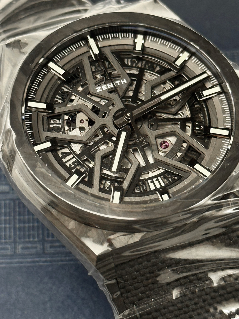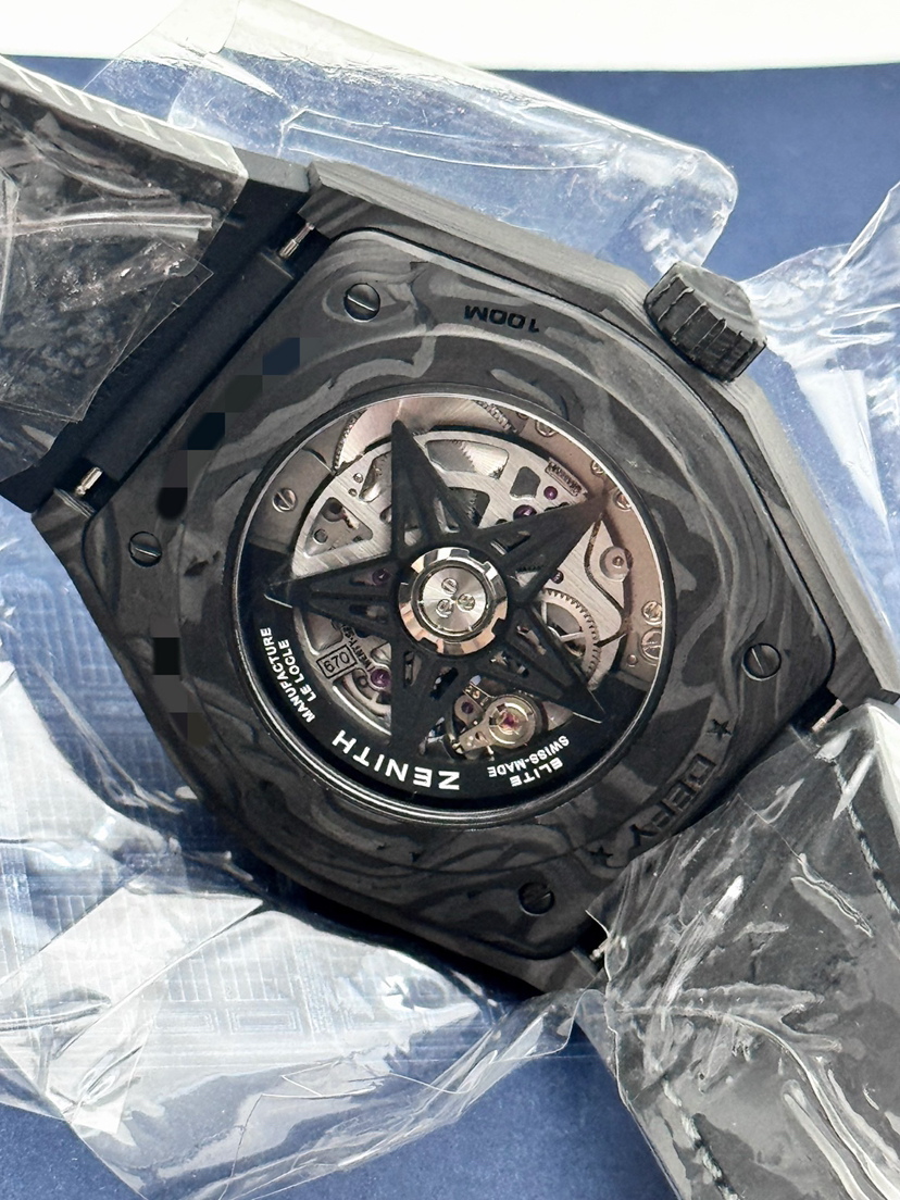 真力时DEFY系列10.9000.670/80.R795 黑色碳纤维表壳钛金属表扣 镂空设计 表径41 自动机械 25年国行全新全套 公价92000 超级好价