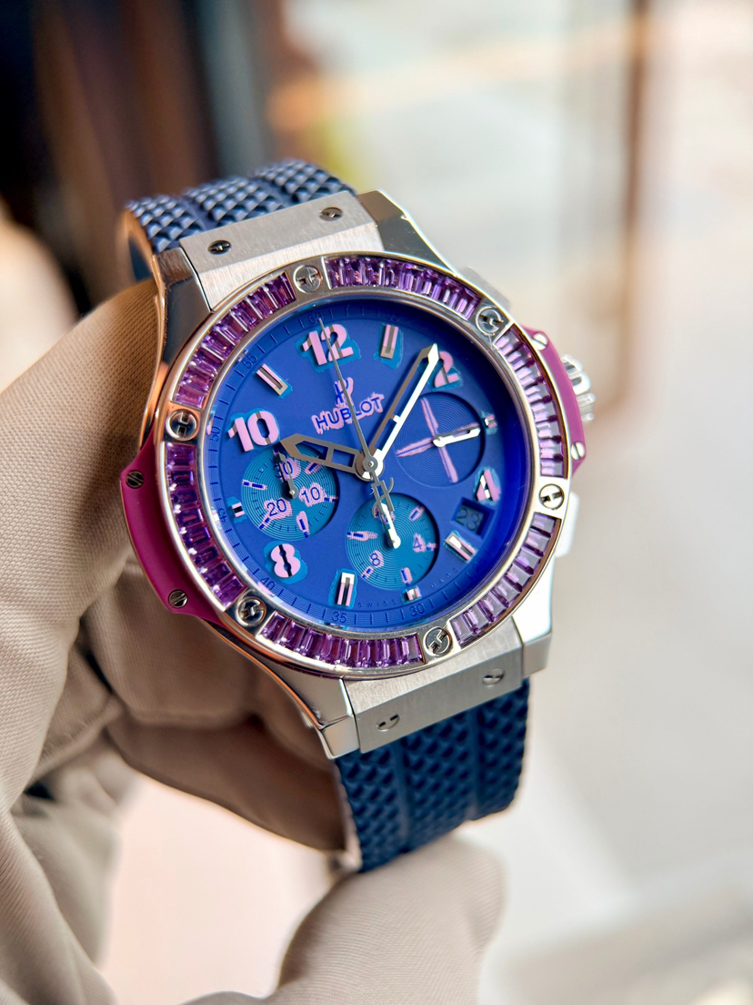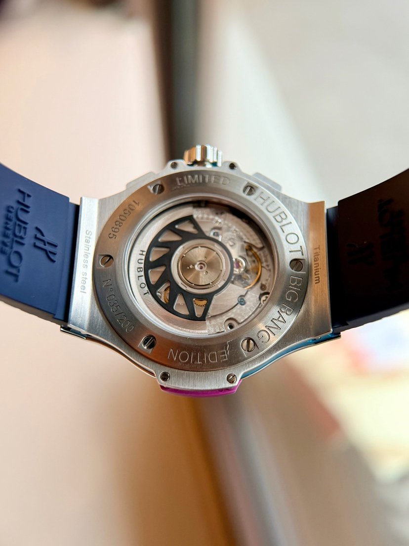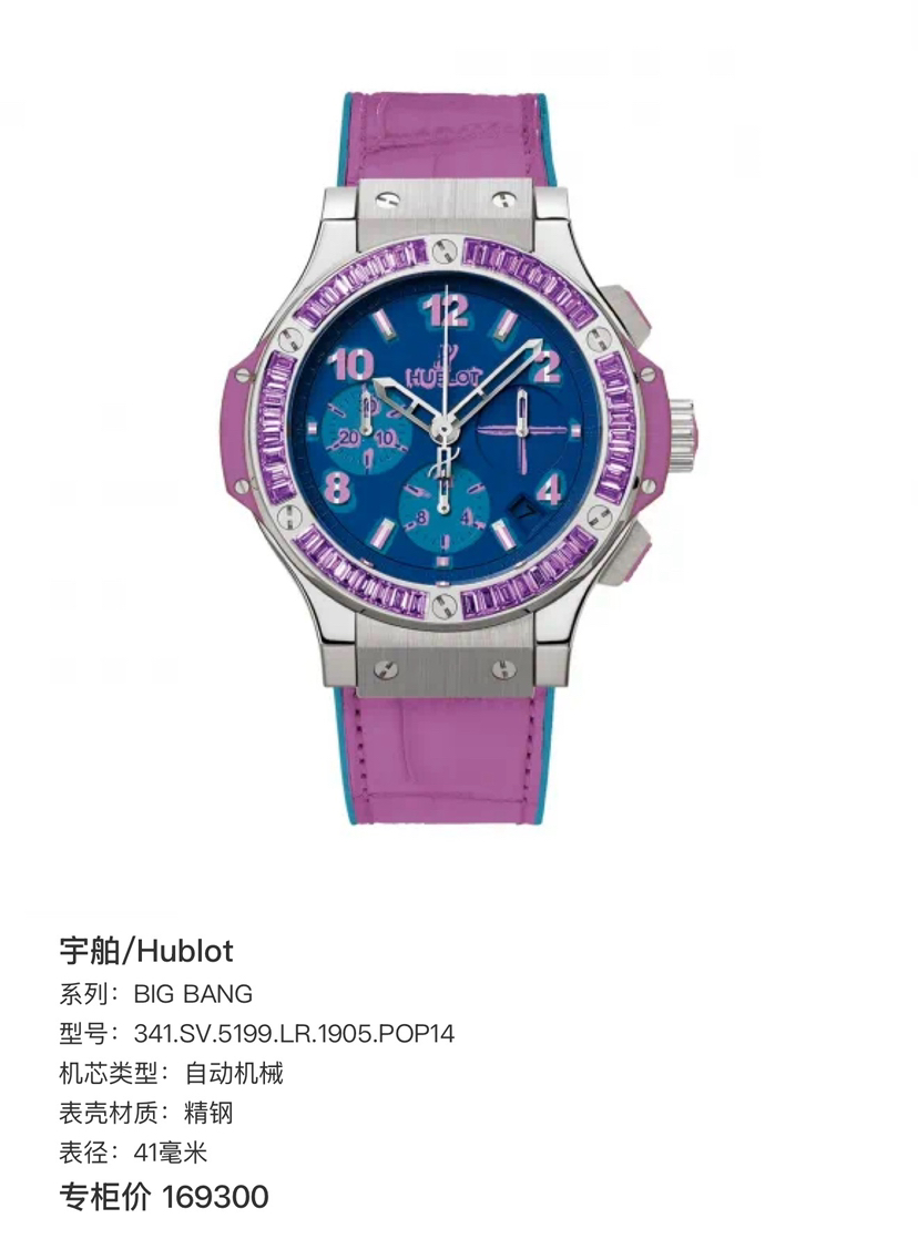 宇舶Big Bang系列341.SV.5199涂鸦卡比龙,41mm表径 精钢材质透底自动机械 计时 日期 飞返,原镶渐变彩宝石外圈 油漆蓝盘涂鸦刻度 宇舶设计非常个性大胆的又一次创新 佩戴舒适性完美,全球限量200支第35支男女佩戴都很时尚,专柜17万,店内现货