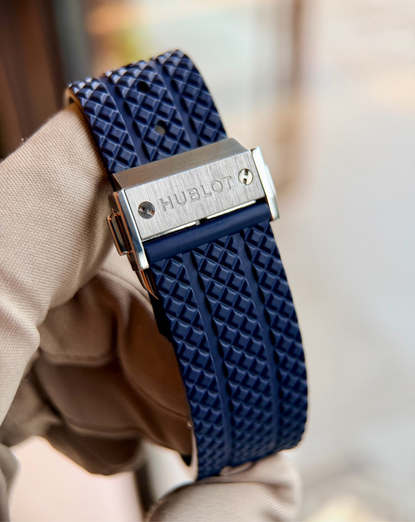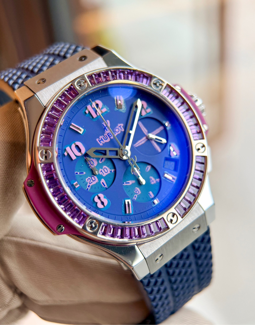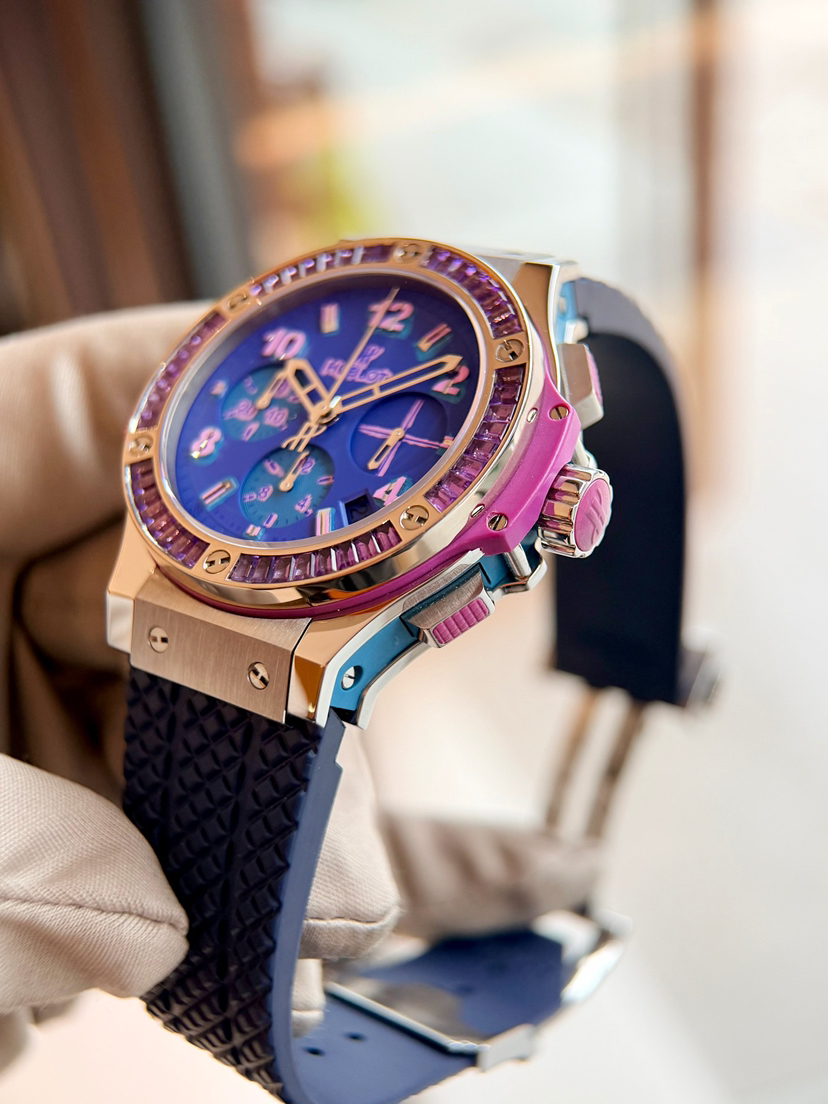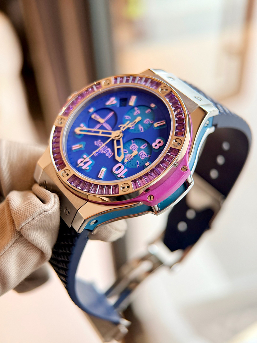 宇舶Big Bang系列341.SV.5199涂鸦卡比龙,41mm表径 精钢材质透底自动机械 计时 日期 飞返,原镶渐变彩宝石外圈 油漆蓝盘涂鸦刻度 宇舶设计非常个性大胆的又一次创新 佩戴舒适性完美,全球限量200支第35支男女佩戴都很时尚,专柜17万,店内现货