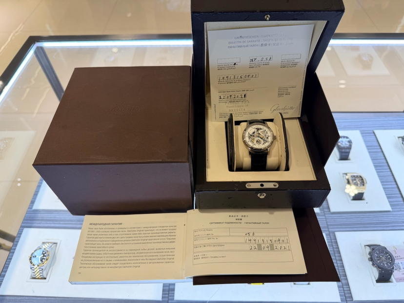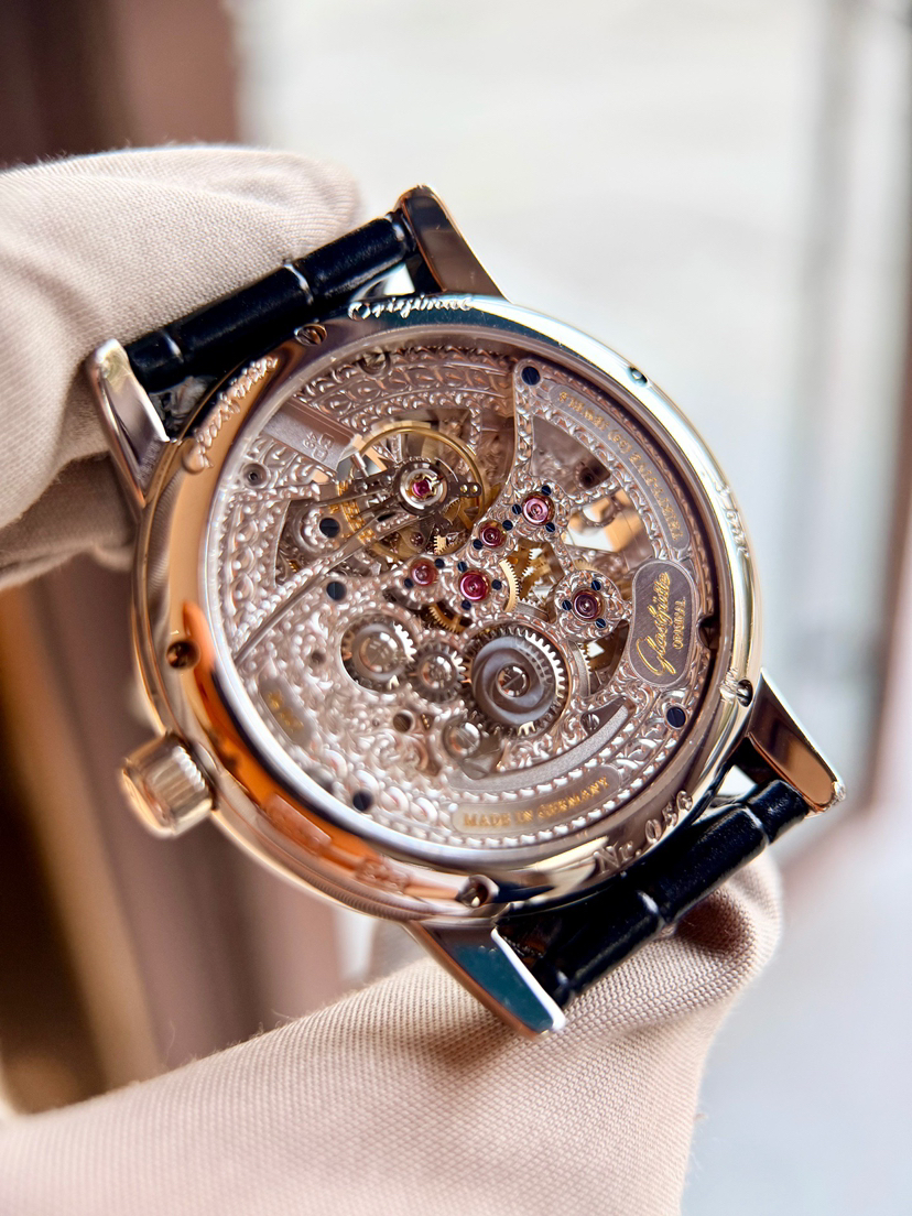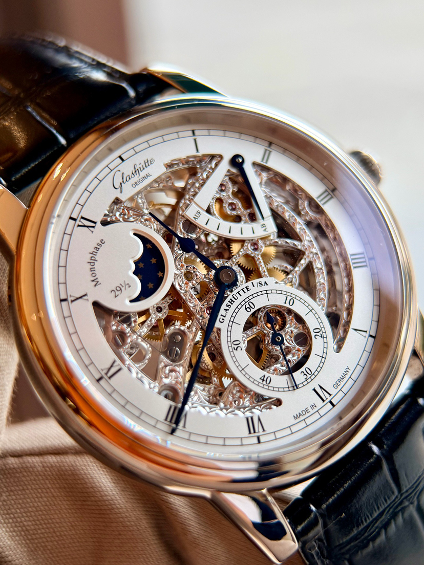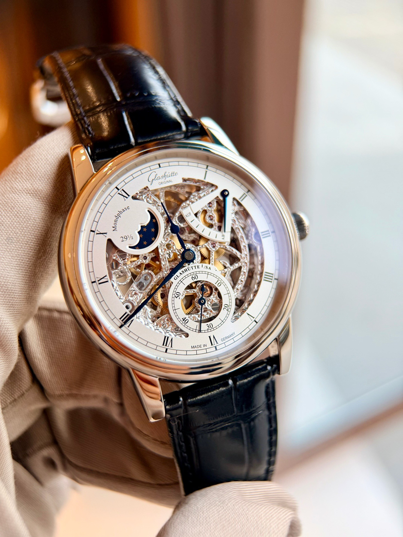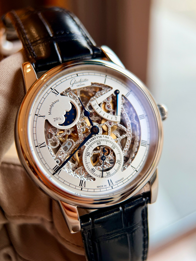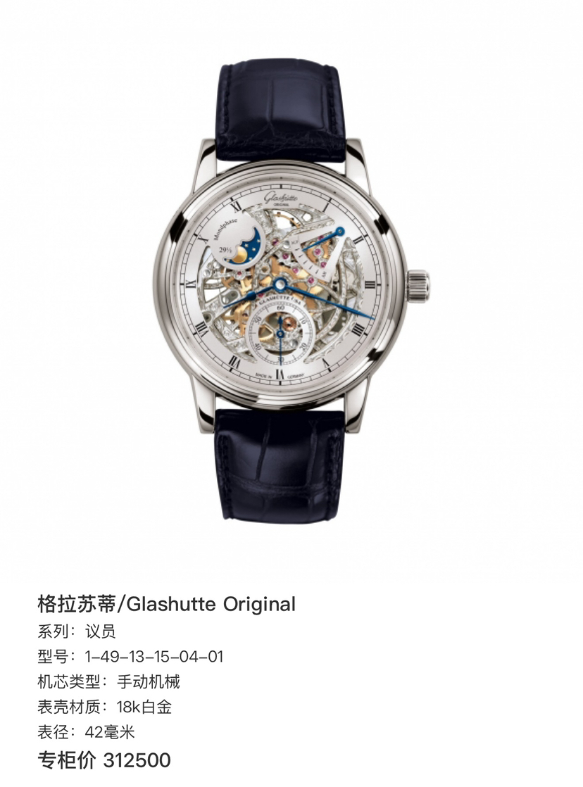 格拉苏蒂原创议员系列1-49-13-15-04-01双镂空,42mm表径 整表18k白金材质 透底手动机械,双面錾刻 表盘机芯之美一览无余,罗马时标 纯银梨形针 月相 动储显示 防水30米,全球限量100支第56支,专柜31.3万元店内现货单表