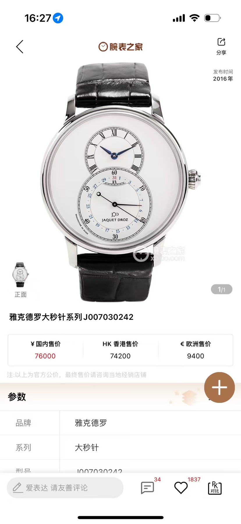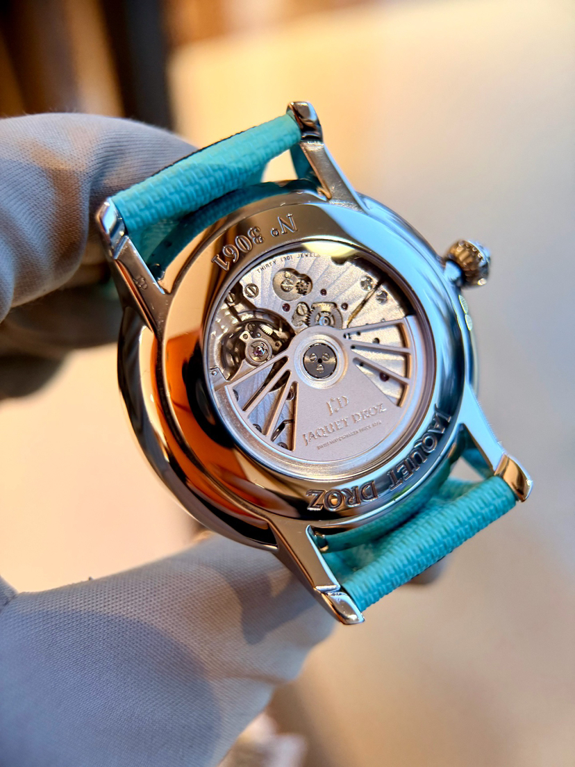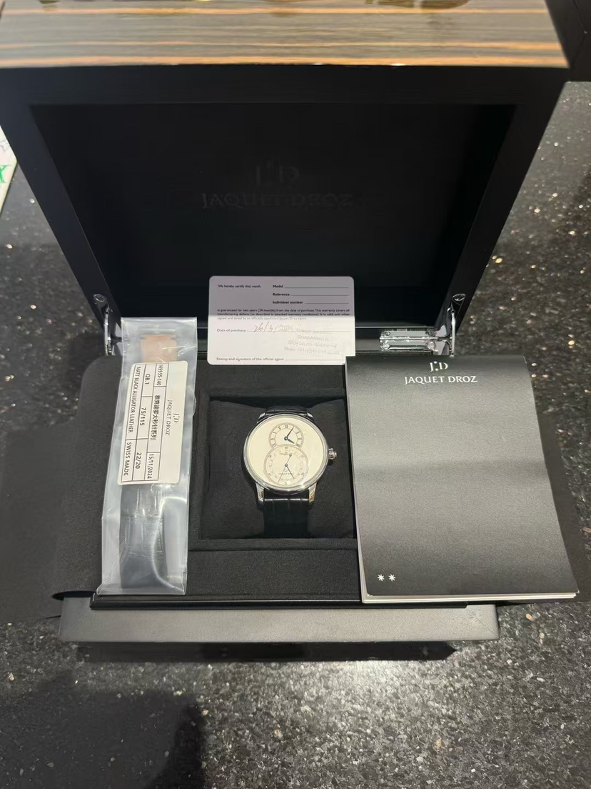 雅克德罗大秒针系列j007030242男士腕表,43mm表径 精钢材质透底自动机械 品牌经典之作以典雅简约之美获得无数赞誉 八字葫芦白色镀银表盘和立体内盘环超级好看,专柜76000元全套,现货