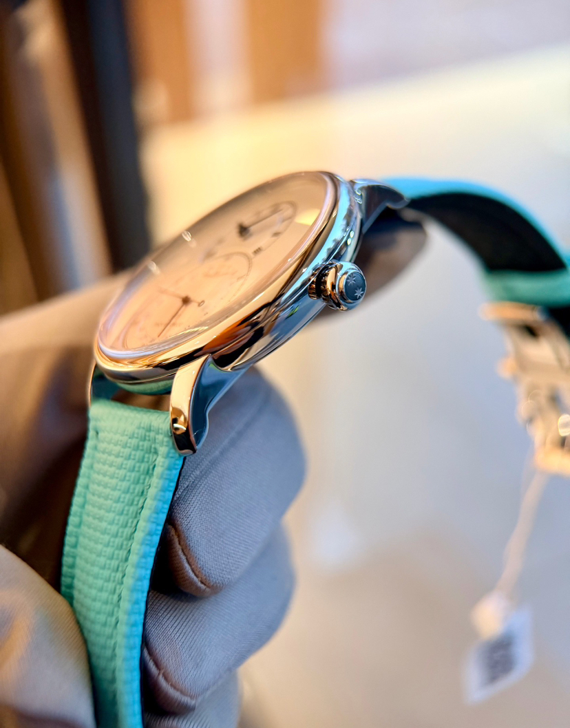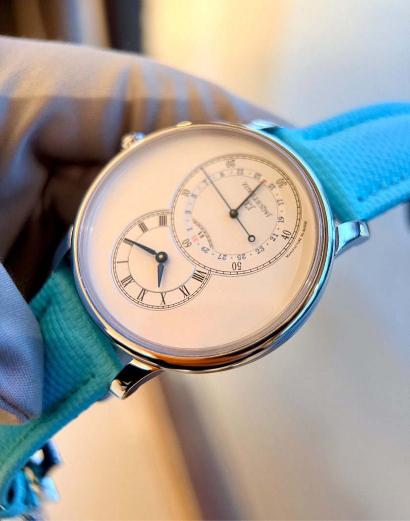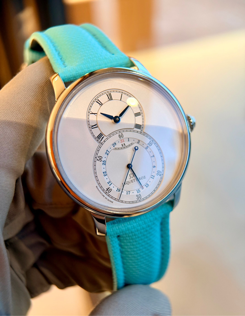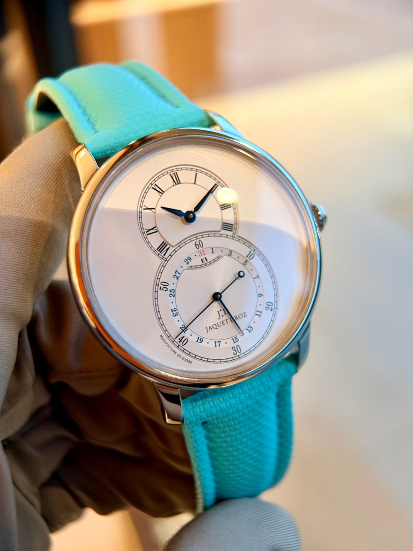雅克德罗大秒针系列j007030242男士腕表,43mm表径 精钢材质透底自动机械 品牌经典之作以典雅简约之美获得无数赞誉 八字葫芦白色镀银表盘和立体内盘环超级好看,专柜76000元全套,现货
