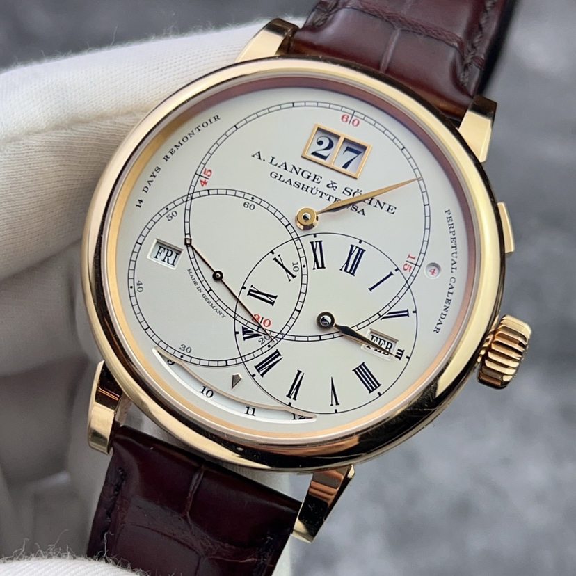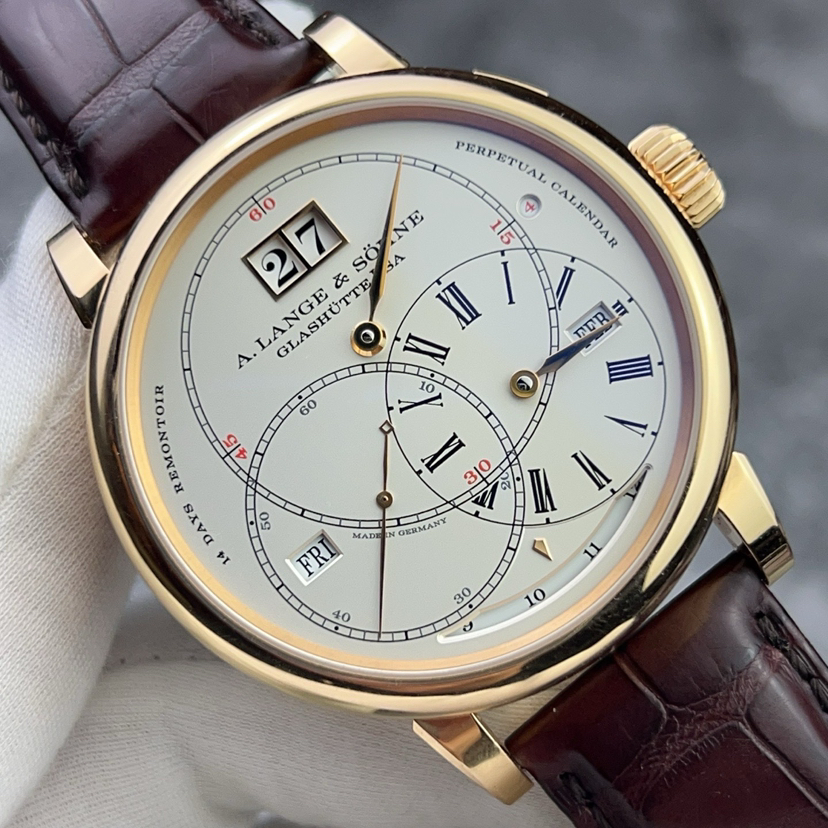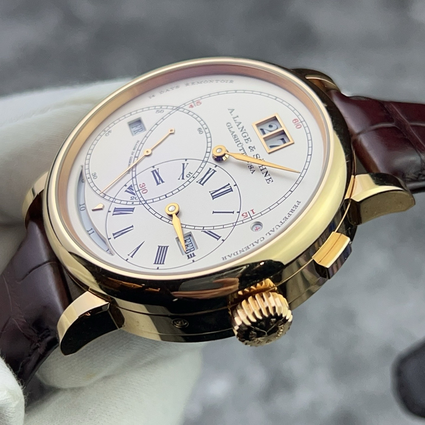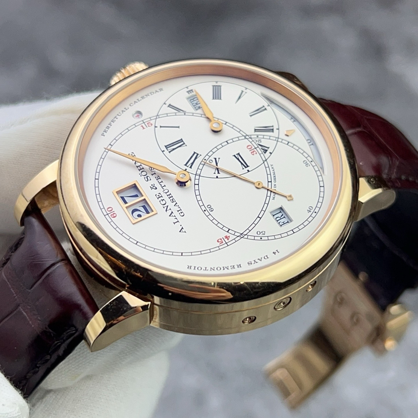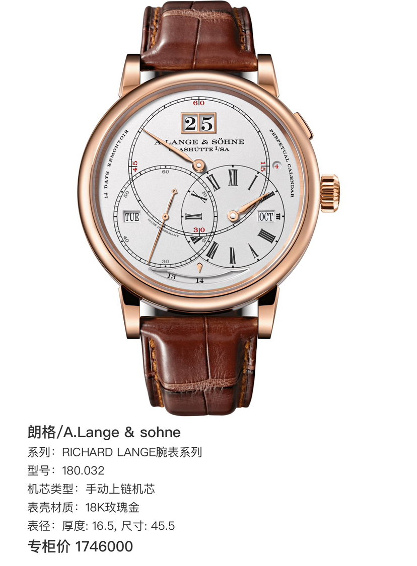 朗格里查德朗格180.032,万年历星宿月相,18K玫瑰金材质,表径45.5mm,银白色表盘,日期、星期、月份、动力储存显示,万年历功能,透底手动机械,十四天长动力,背面星宿月相显示,大折叠扣,公价174.6万,现货一枚好价
