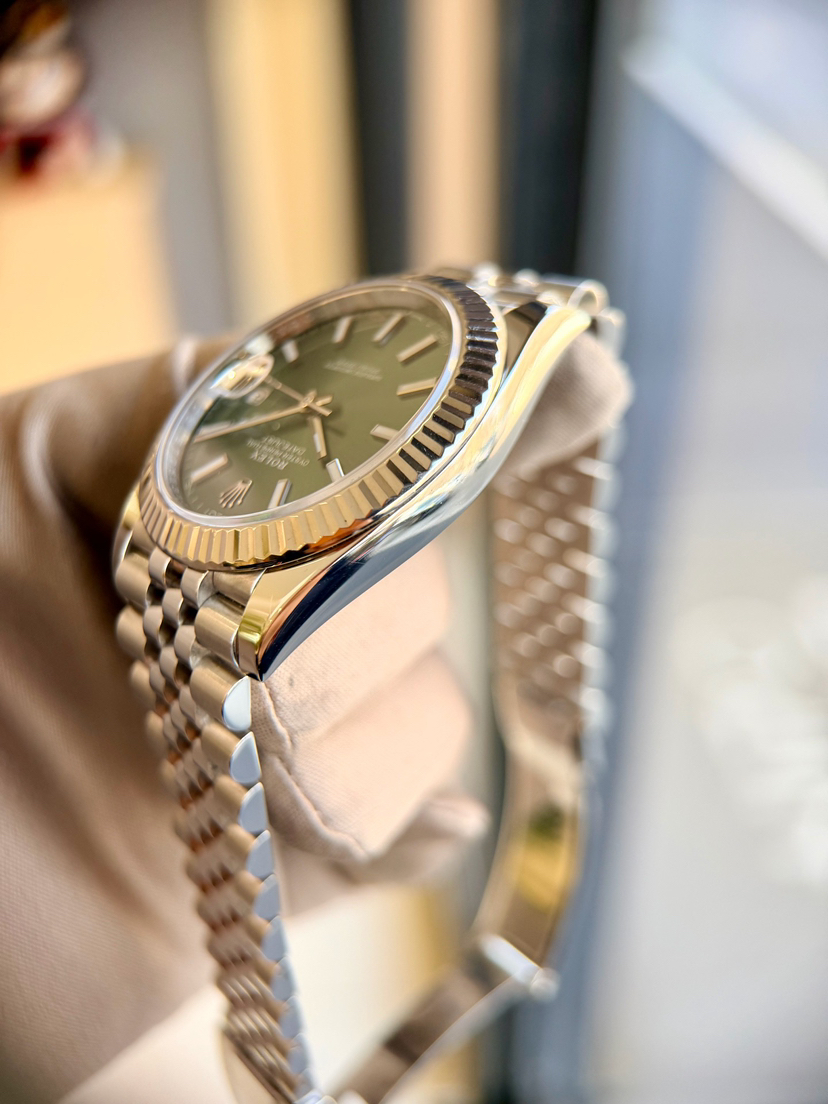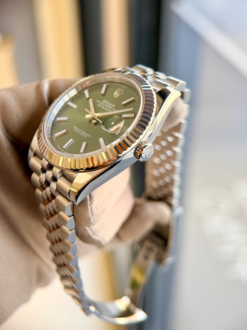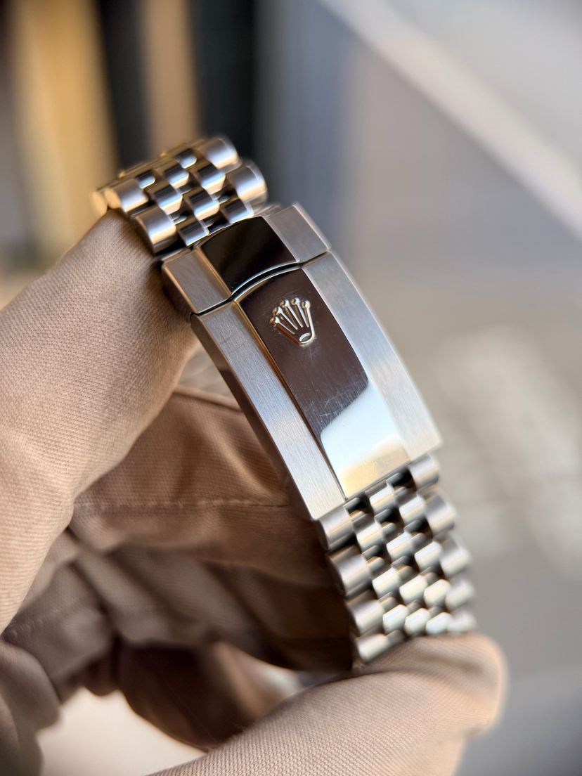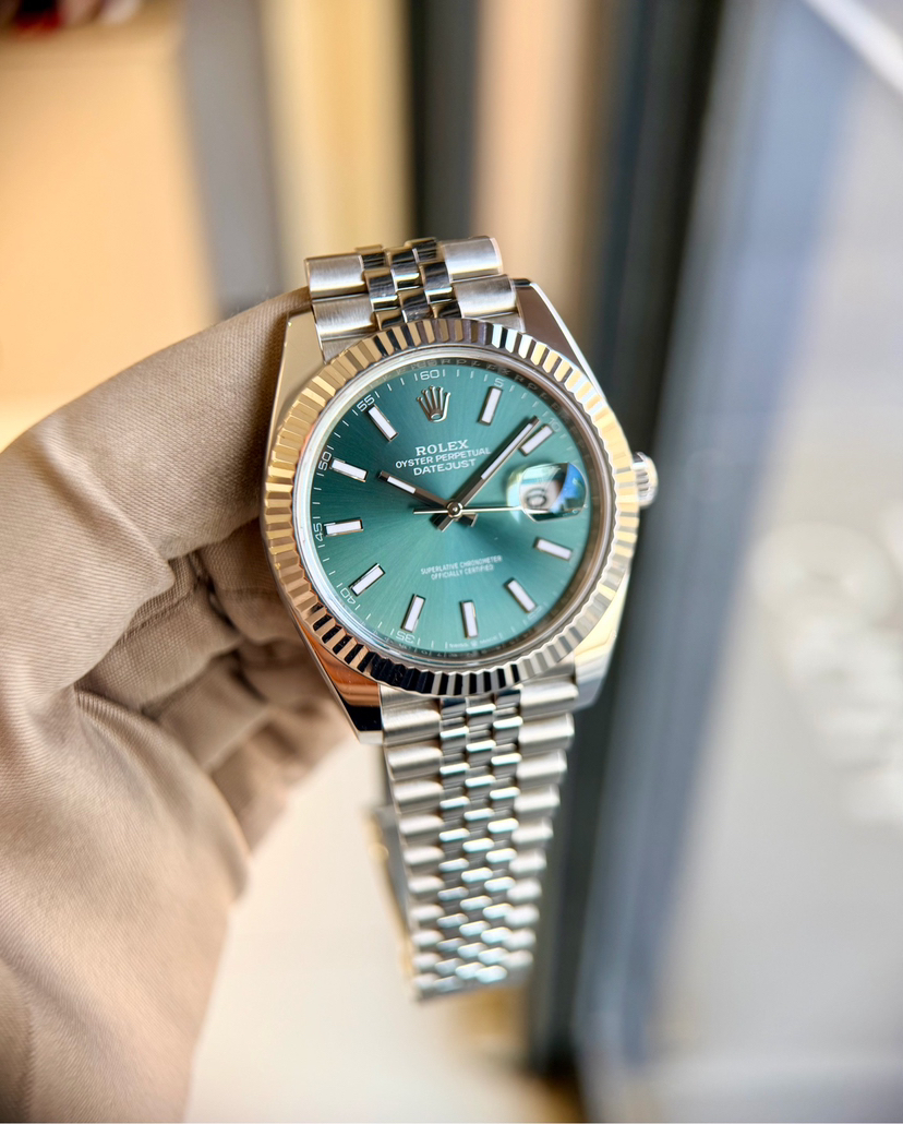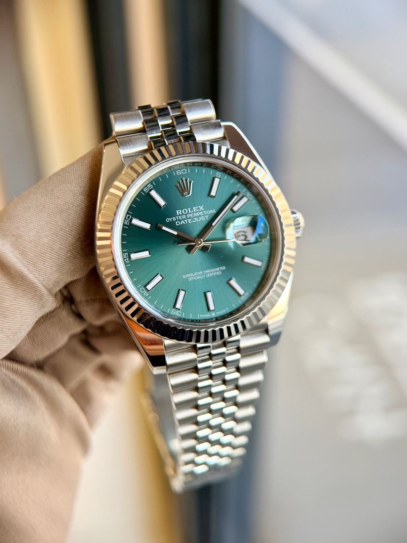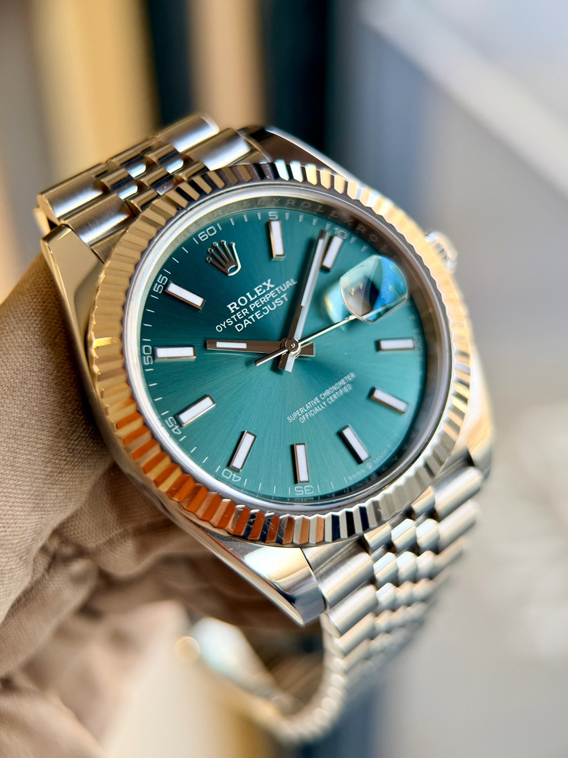 劳力士日志系列126334-0028薄荷绿,41mm表径 精钢材质18k白金狗牙圈锋利无比,放射绿盘条形刻度 颜值及佩戴舒适度非常完美,热门经典款店内现货全套全长1x万元
