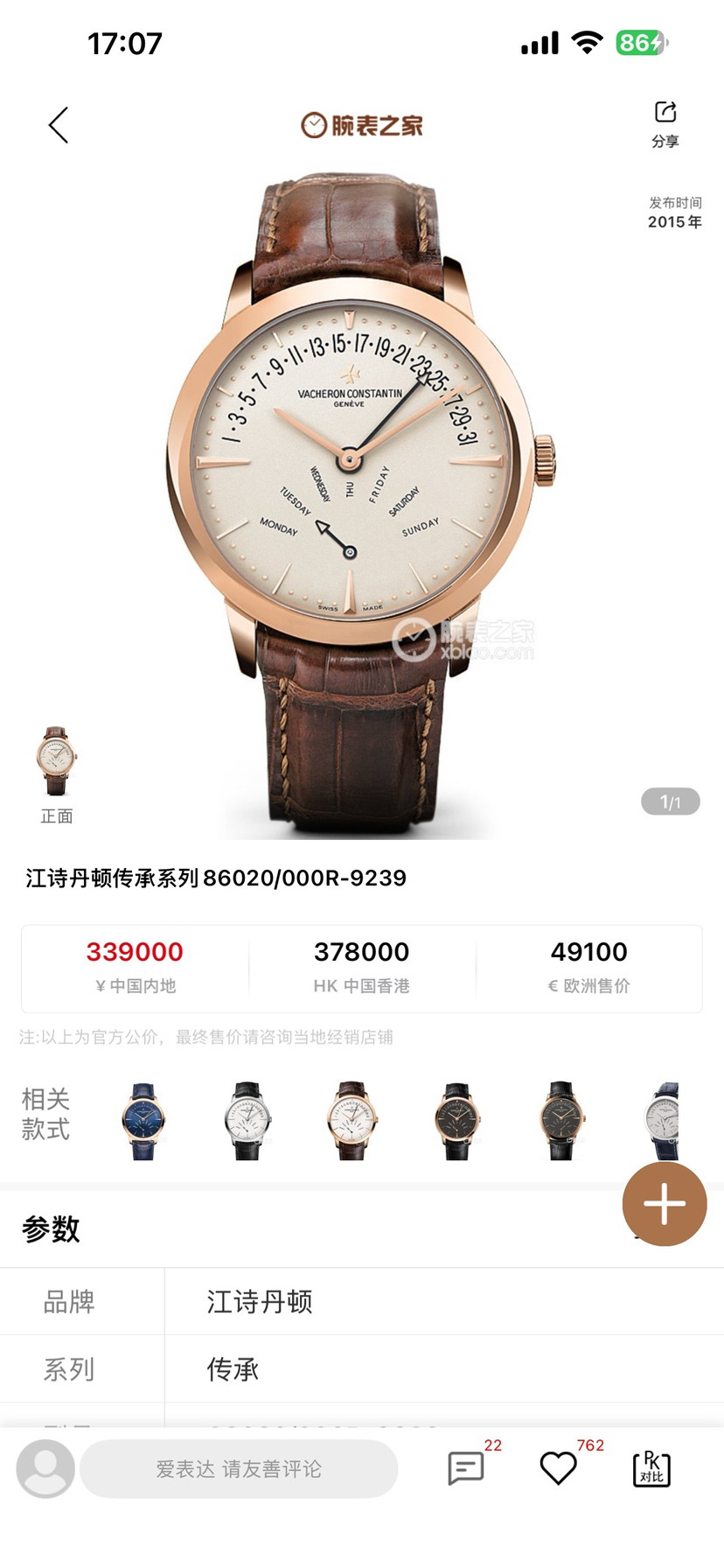 江诗丹顿/Vacheron Constantin 传承 86020/000R-9239 自动机械 18K