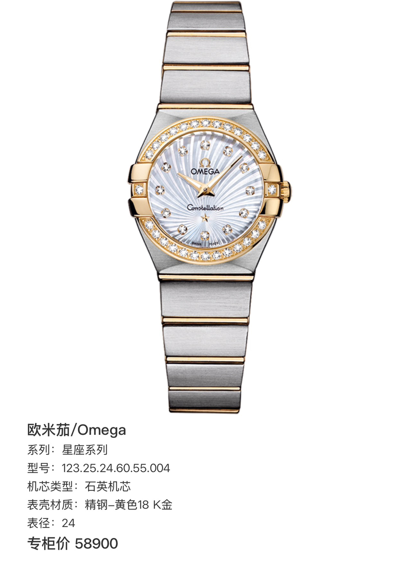 欧米茄/Omega 星座系列 123.25.24.60.55.004 石英机芯 精钢‑黄色18 K金 24 专柜价58900
