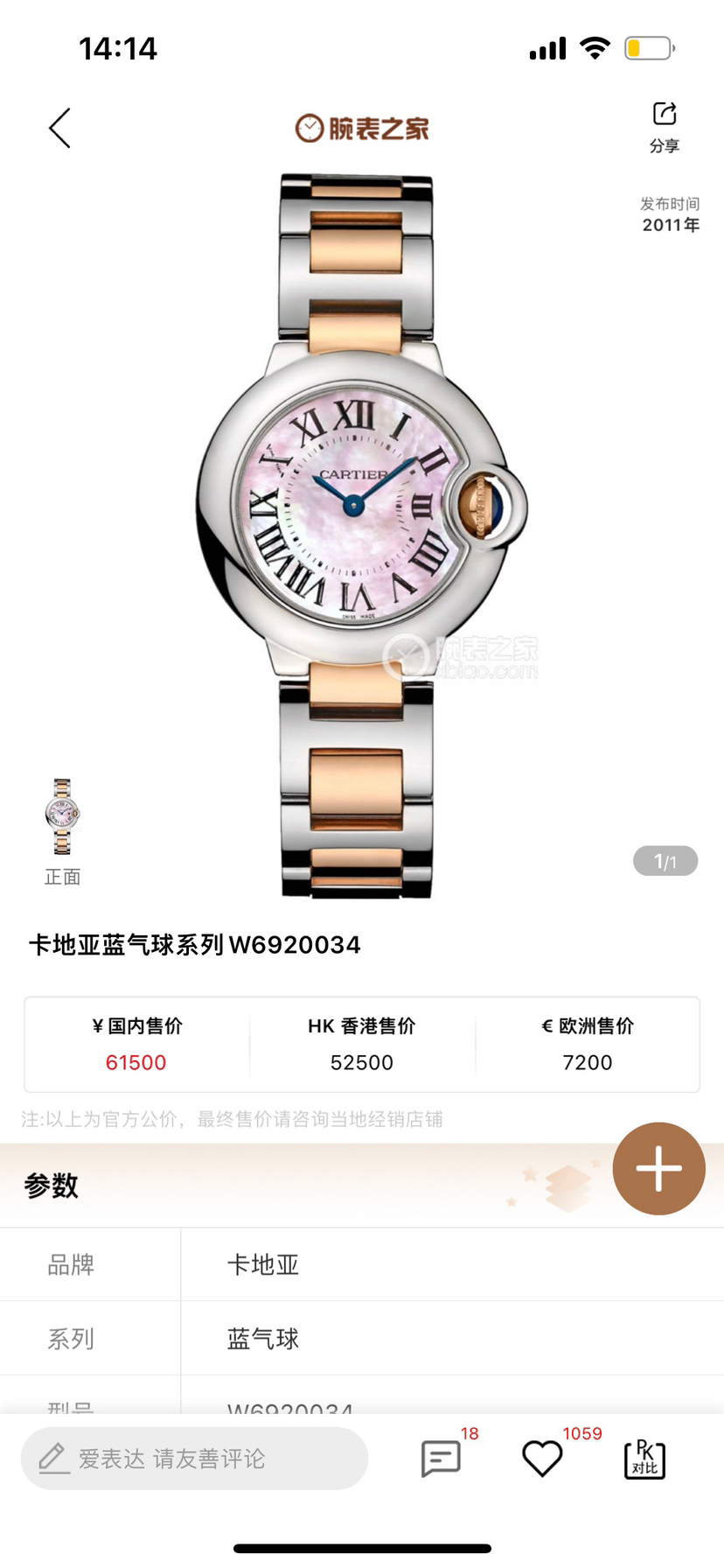 卡地亚/Cartier 蓝气球 W6920034 石英 精钢 28.6毫米 附件:单表 专柜价61500