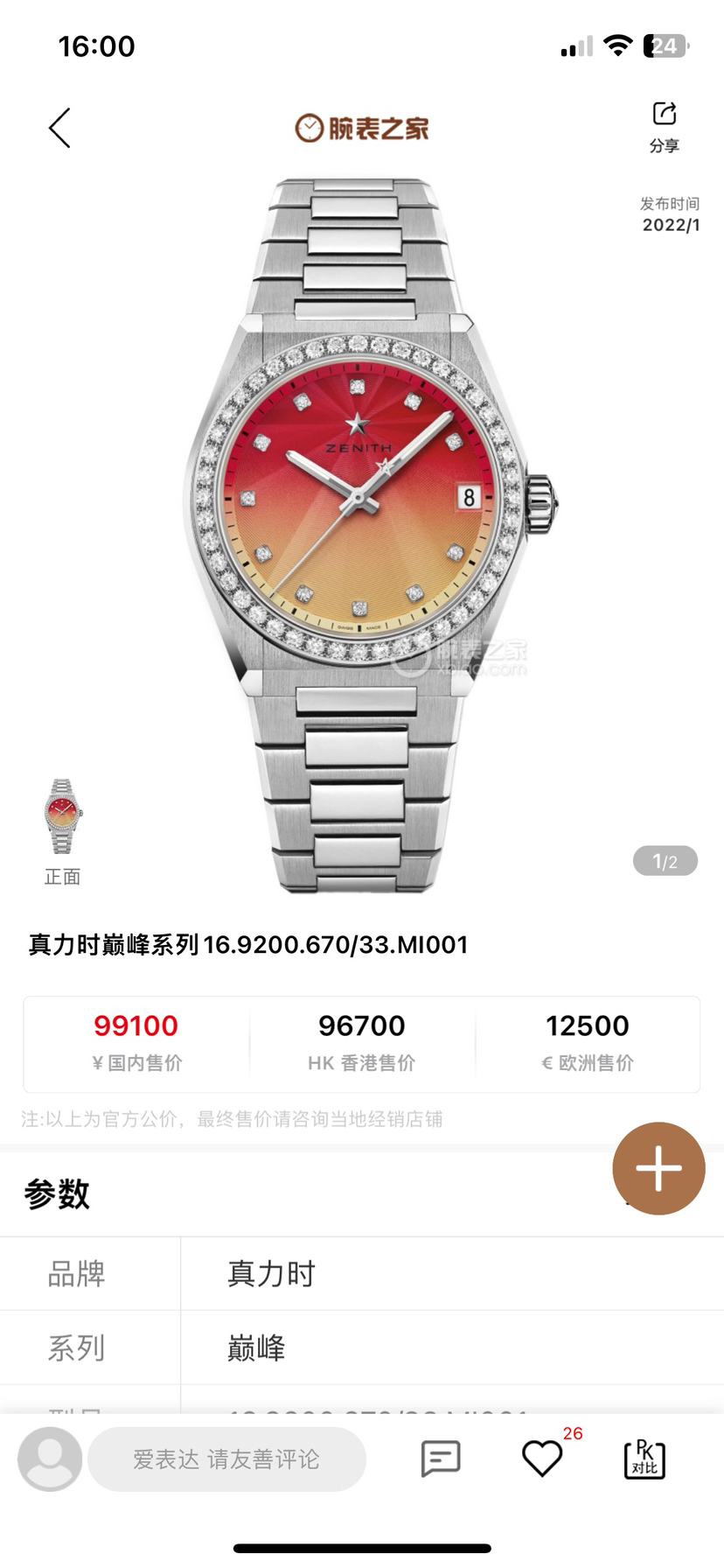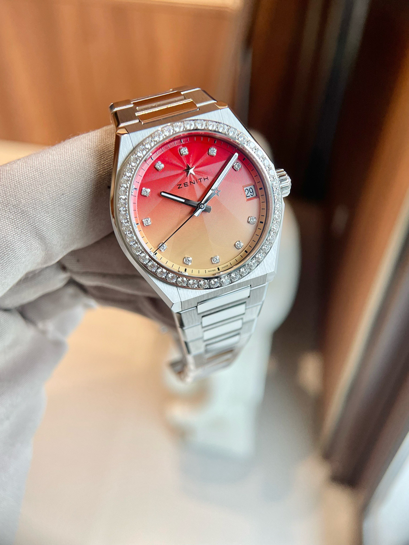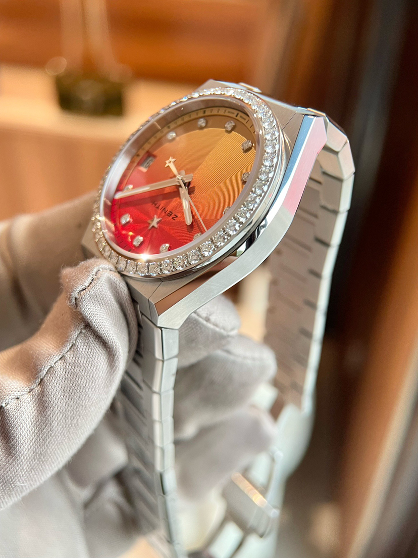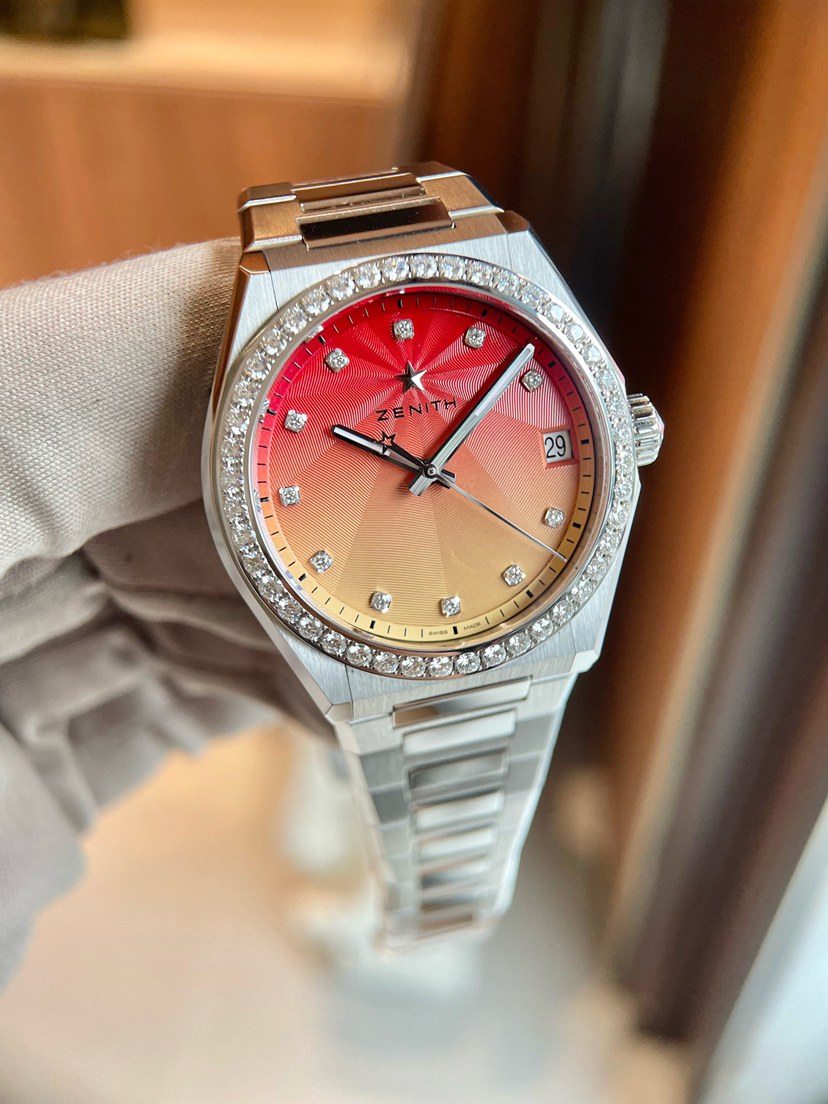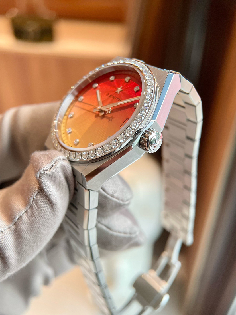 真力时 巅峰系列 Defy 渐变日落黄!16.9200.670/33.MI001,原钻,最新款渐变盘,自动机械,36MM!4条原装快拆表带,国行23年7月国行全套,化妆镜盒!只有VIP才能给的盒子!公价99100,好价