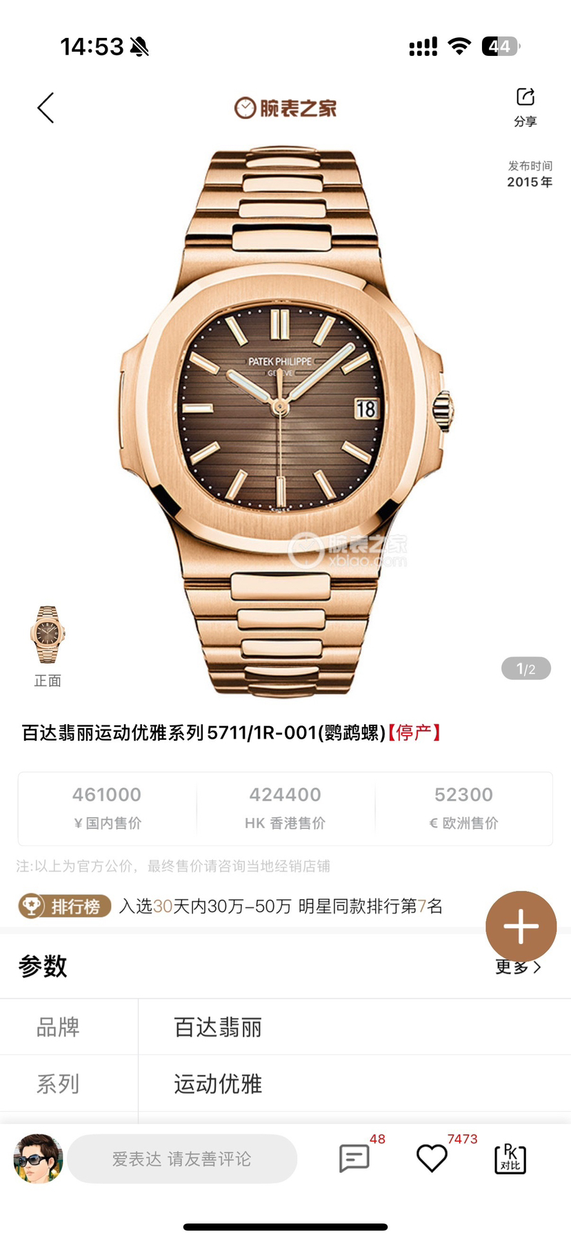百达翡丽运动优雅 鹦鹉螺 5711/1R-001机械男性