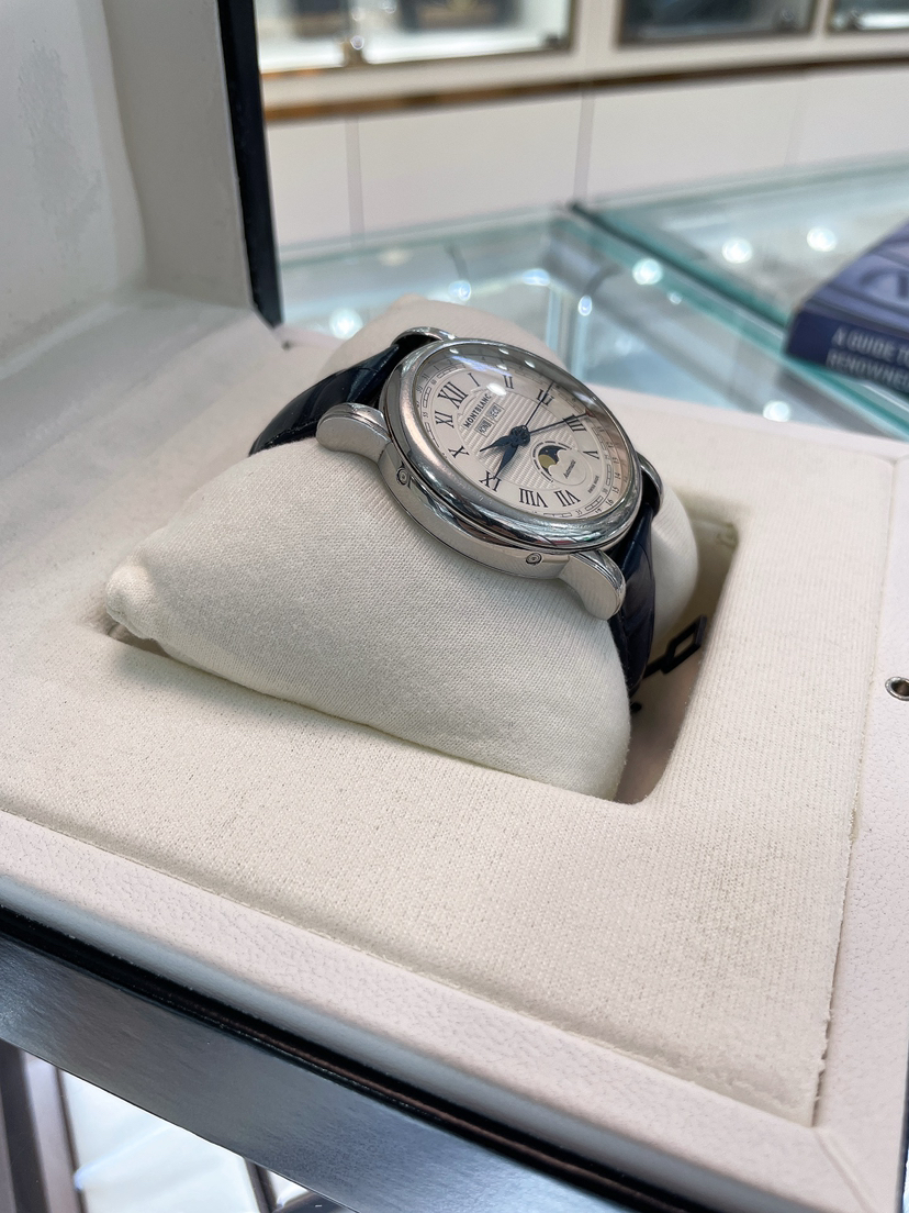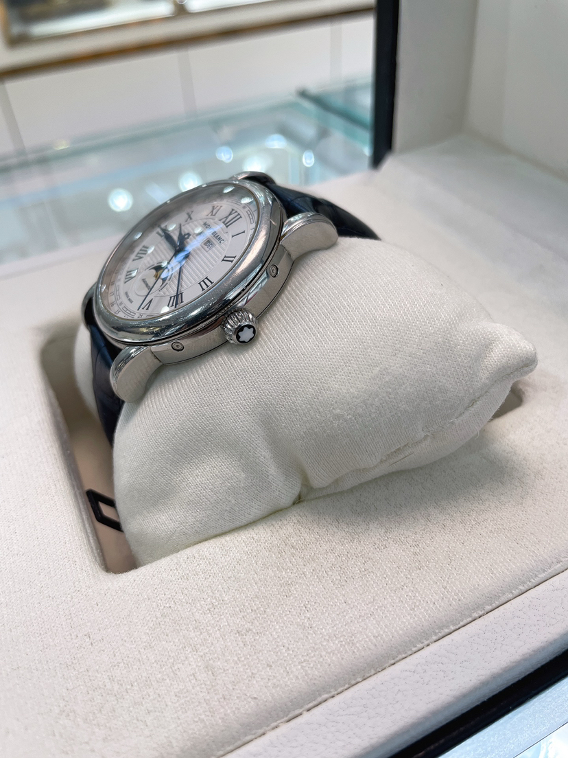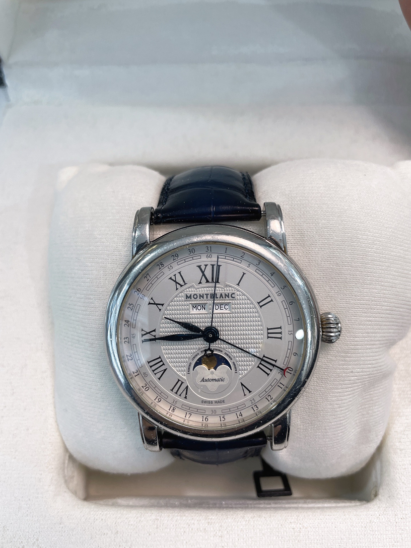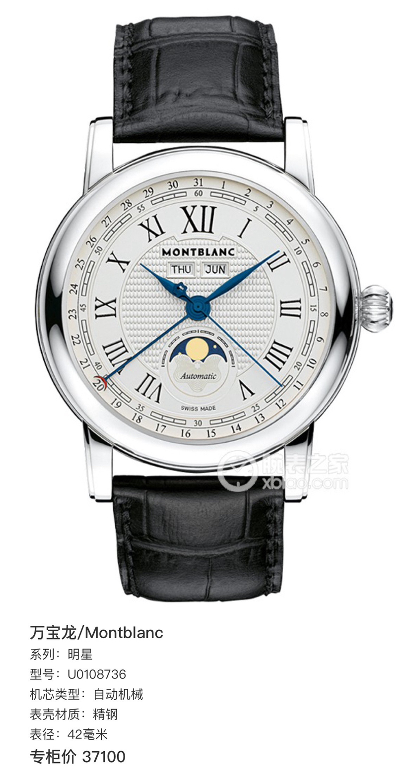 万宝龙明星系列U0108736,自动机械男士腕表,表盘42mm,日期显示/星期显示/月份显示/月相显示,银白色表盘,中央配以扭索雕花,刻度则采用了传统风范,黑色的罗马数字,搭配以柳叶形蓝钢指针更显古典雅致,专柜公价37100,现货单表好价……。