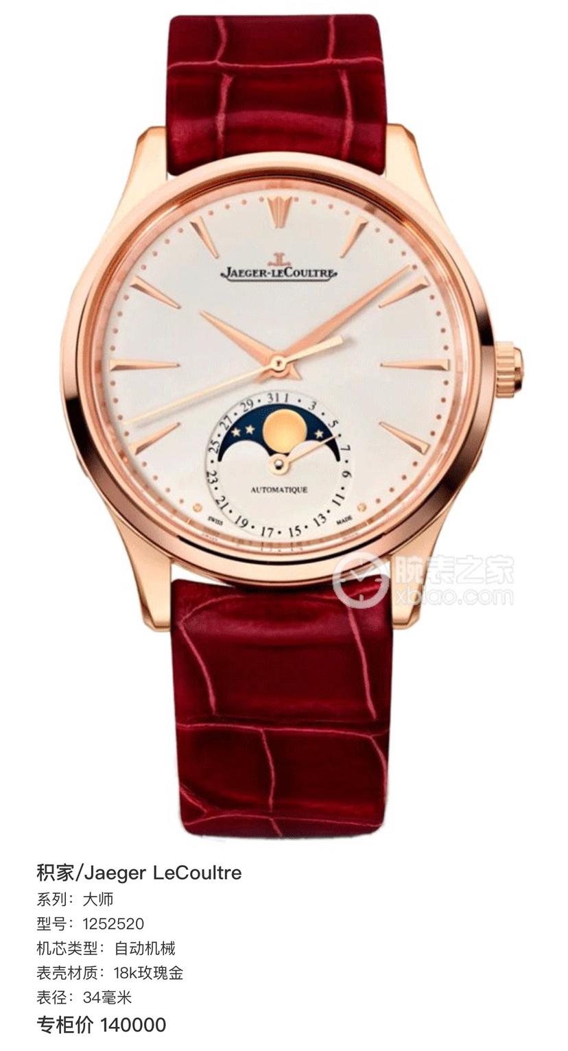 积家/Jaeger LeCoultre 大师 1252520 自动机械 18k玫瑰金 34毫米 附件:全套 专柜价140000。