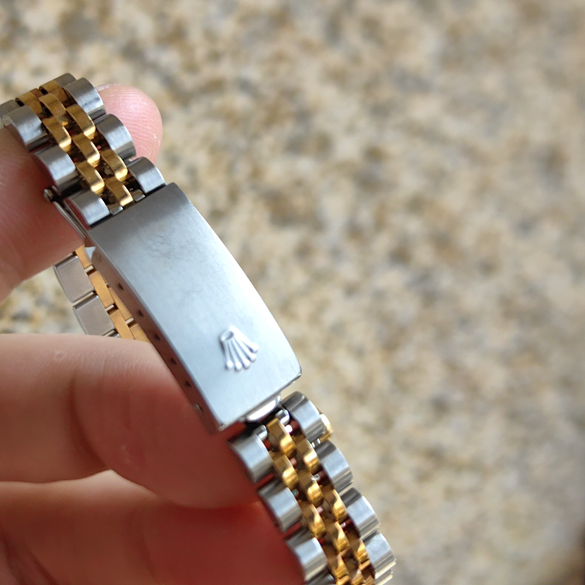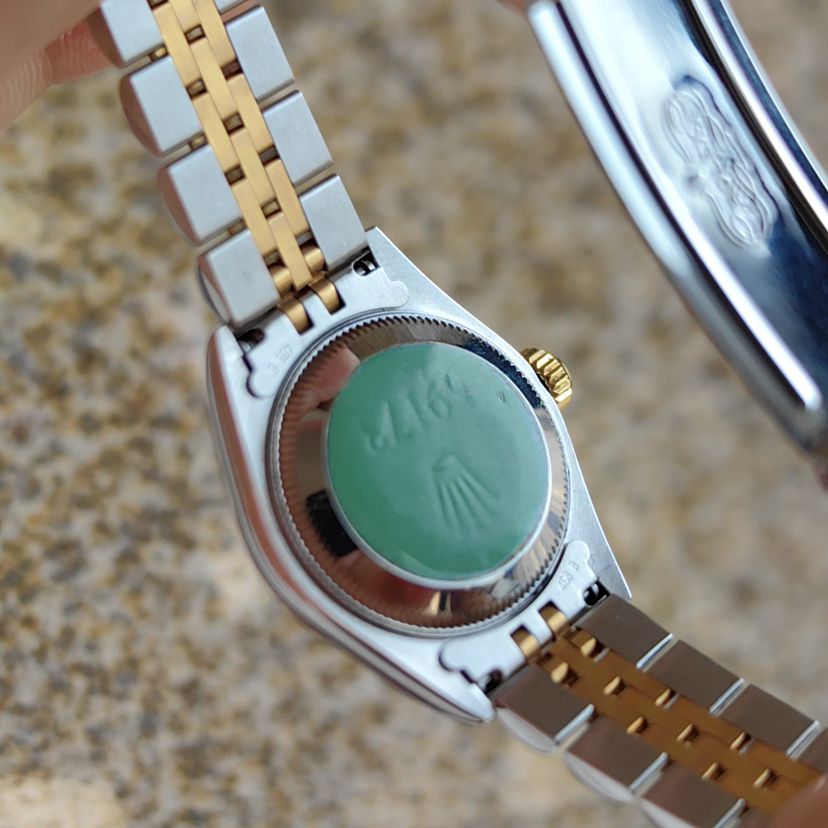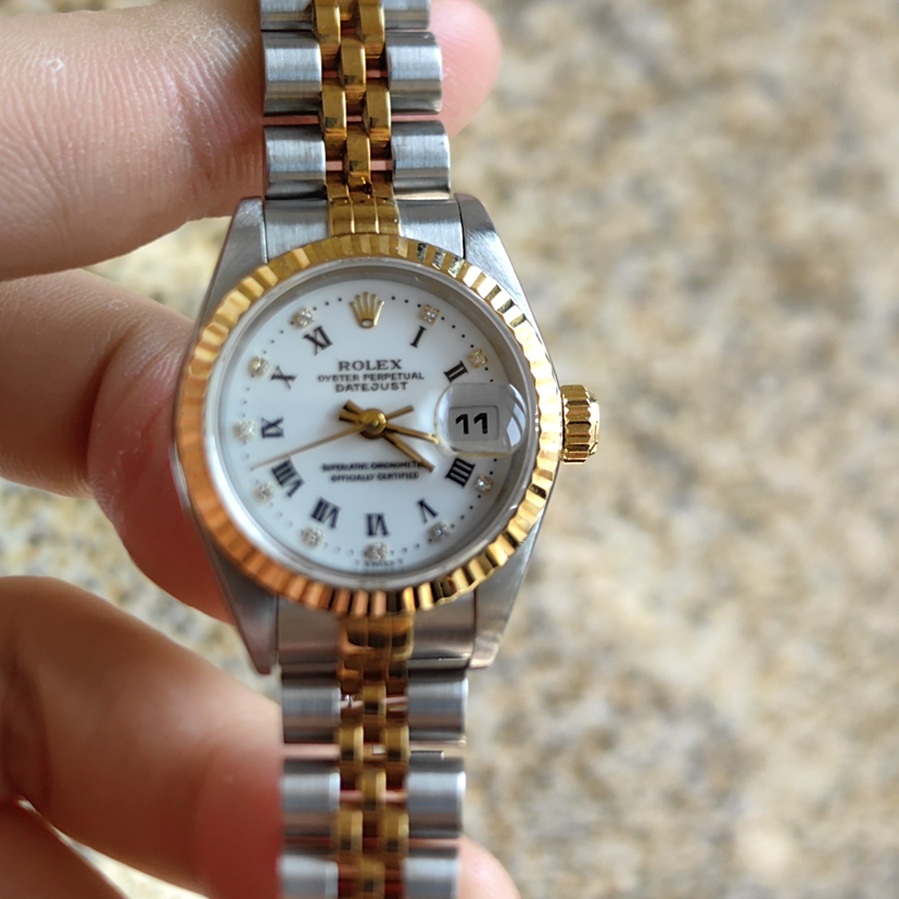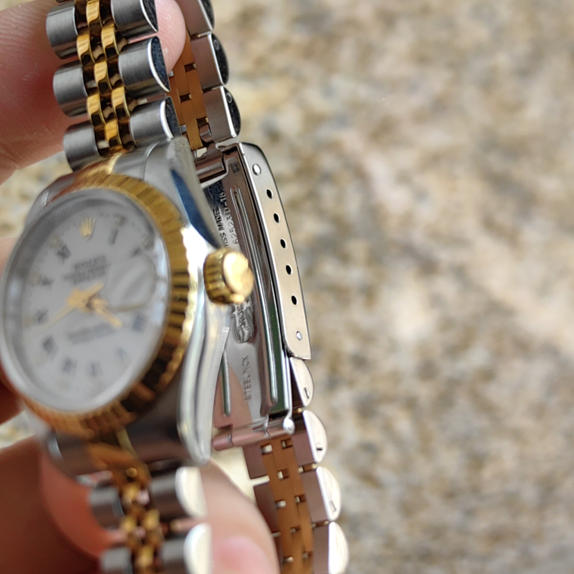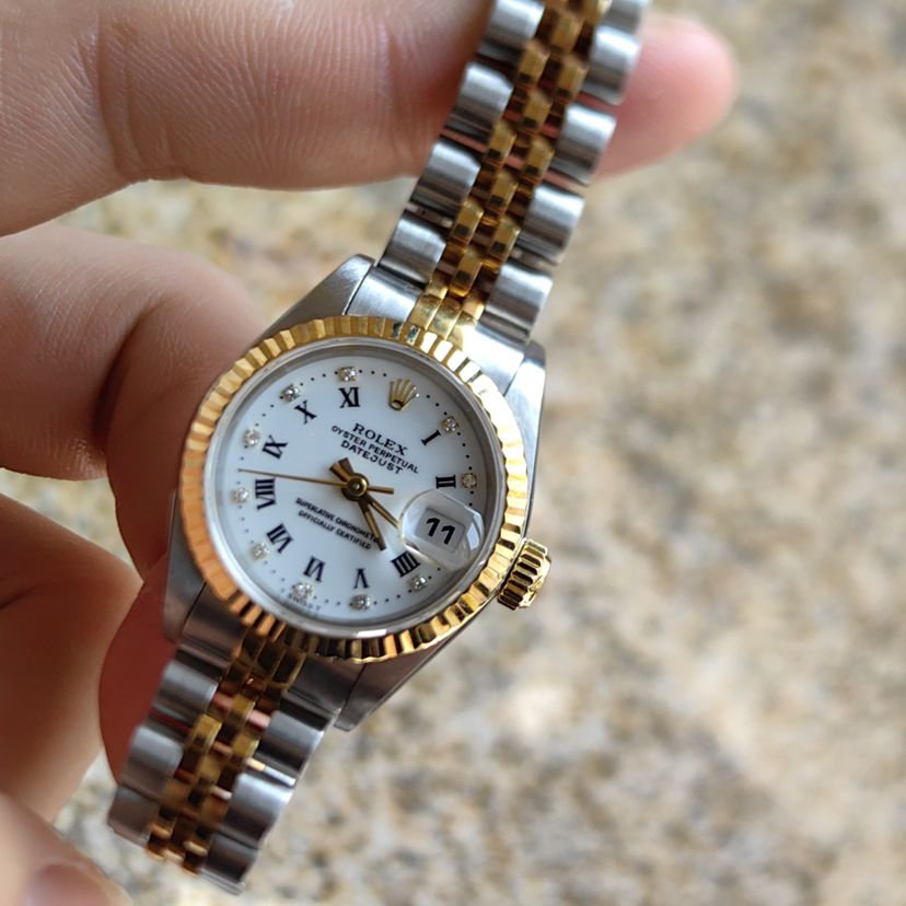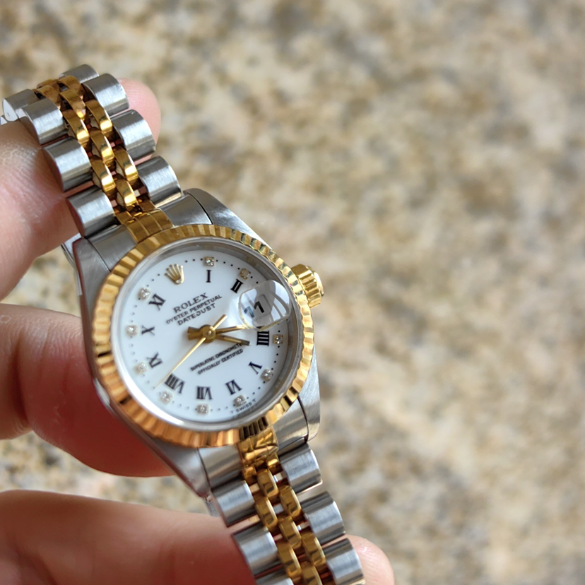 劳力士日志型69173女士腕表,自动机械,表径26mm,18k间金材质,儒雅象牙白盘,钻石刻度 经典狗牙圈,日期显示 客户闲置近新未使用品相 可遇不可求