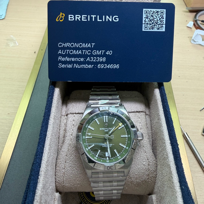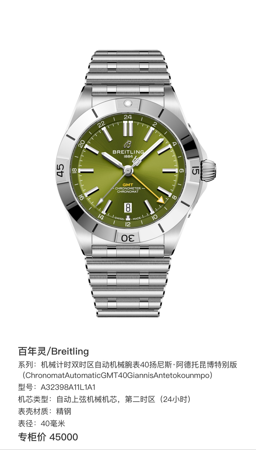 百年灵/Breitling 机械计时双时区自动机械腕表40扬尼斯·阿德托昆博特别版(ChronomatAutomaticGMT40GiannisAntetokounmpo) A32398A11L1A1 自动上弦机械机芯,第二时区(24小时) 精钢 40毫米 专柜价45000, 全新未使用品, 带侧膜 背膜, 限量版 , 现好价