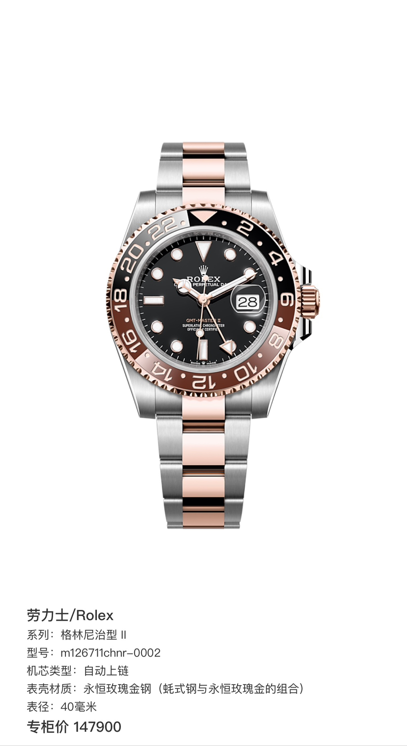 劳力士/Rolex 格林尼治型 II m126711chnr-0002 自动上链 永恒玫瑰金钢(蚝式钢与永恒玫瑰金的组合) 40毫米 专柜价157700