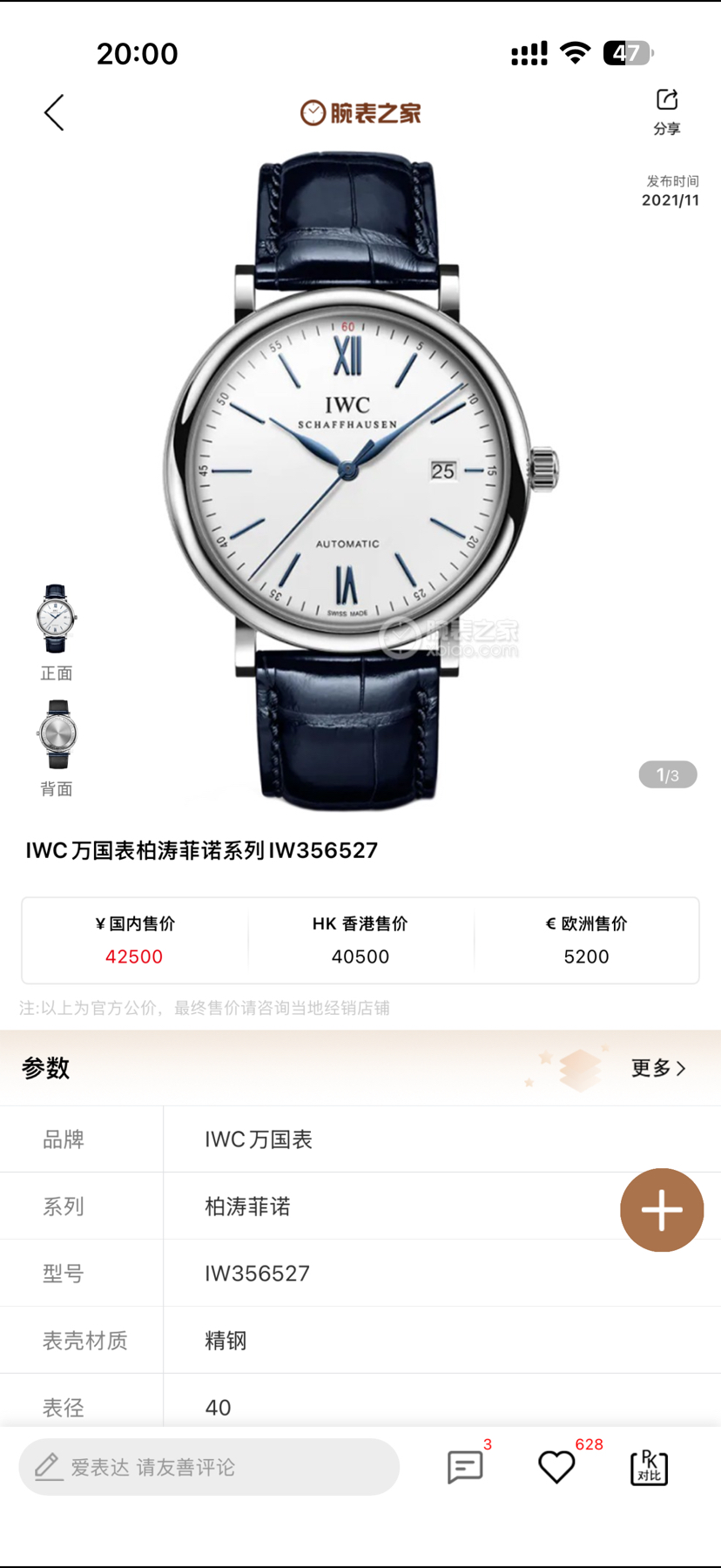 IWC/万国表 柏涛菲诺系列 IW356527 自动机械,40毫米,男士精钢腕表,专柜价:¥42500。25年全新全套未使用品,送礼自用非常划算,现货好价!