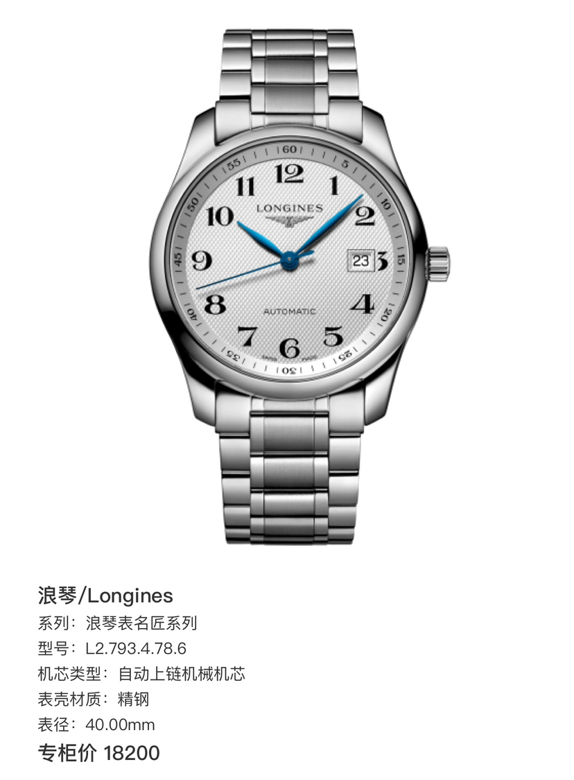 浪琴 名匠系列 L2.793.4.78.3 自动机械 男士手表 40mm表径 精钢材质 。专柜价:¥18200。25年全新全套,未使用品,全国联保5年,现货好价!