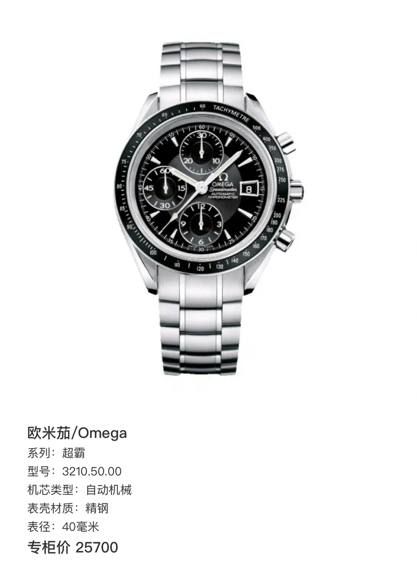 欧米茄 超霸系列 型号:3210.50.00 男士自动机械表,表径40mm,黑色字面。专柜价25700。单表无附件,现货好价!