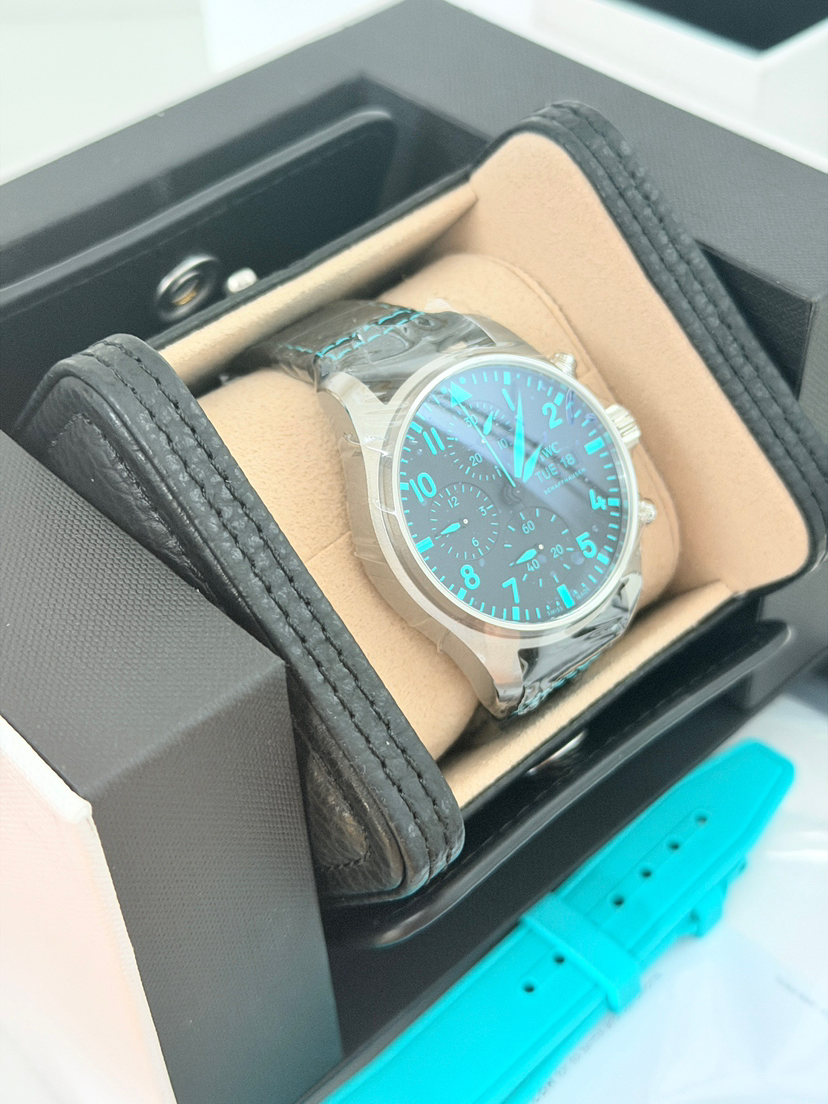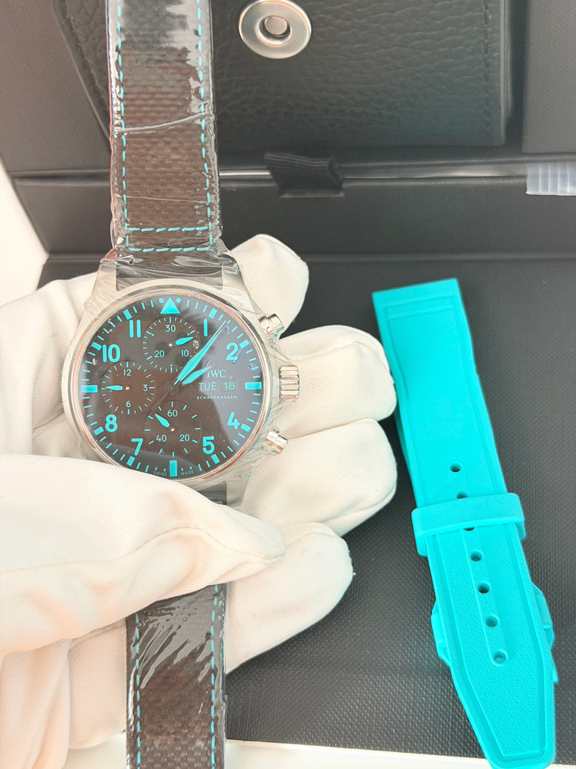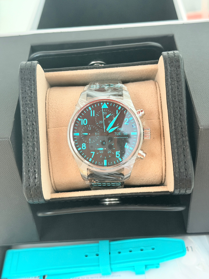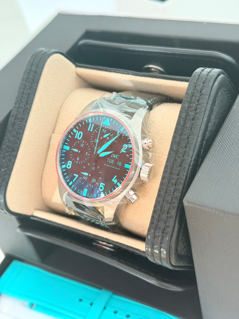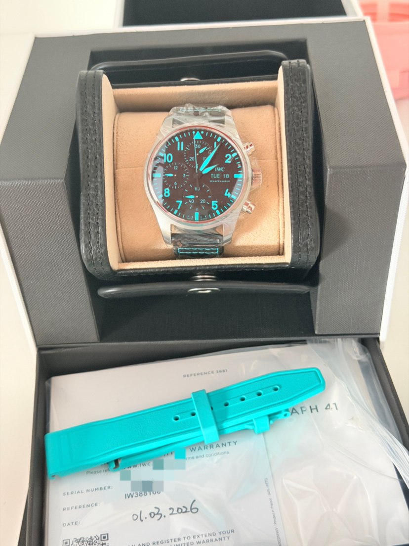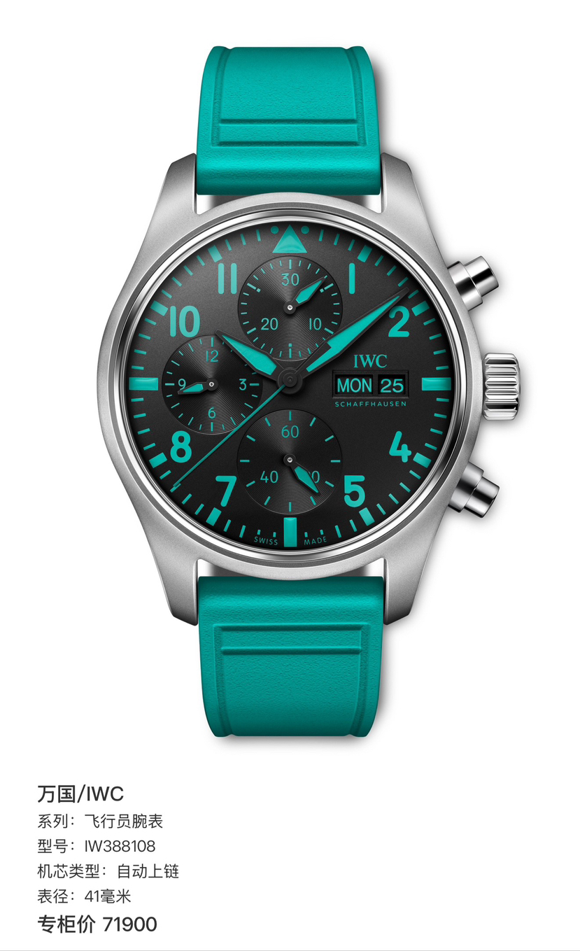 万国/IWC 飞行员腕表 IW388108 梅赛德斯-AMG马石油F1车队特别版 41毫米表径自动机械男表 搭载69385机芯 背透设计 钛金属外壳 橡胶表带针扣 双表带,蒂芙尼绿 专柜价69800 26年3月全新全套未使用品,现货好价!