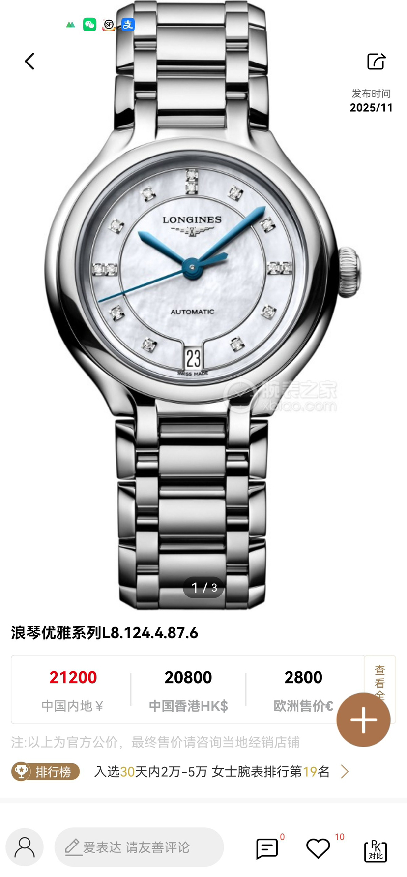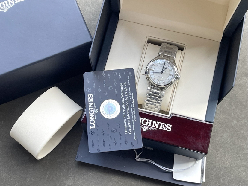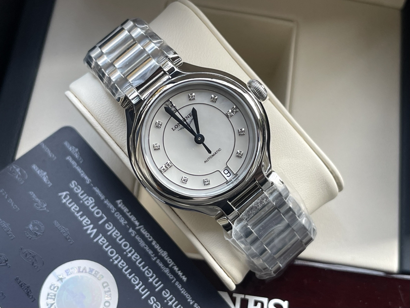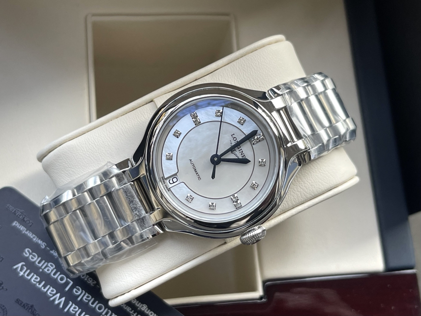 浪琴优雅系列 L8.124.4.87.6 自动机械女表、 表经34.00mm 新款新月、贝母内镶钻,专柜价21200,整表未使用品,现货好价
