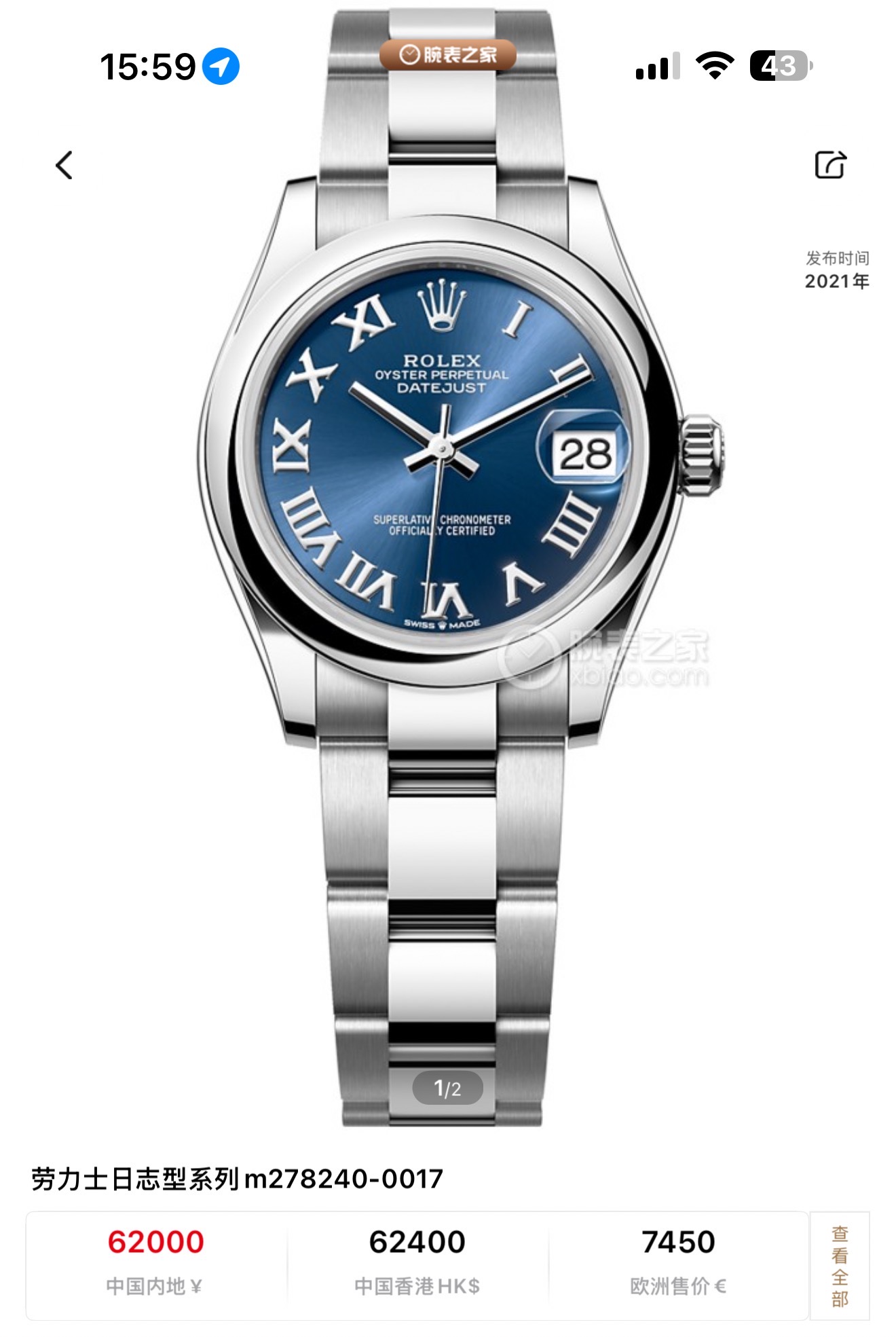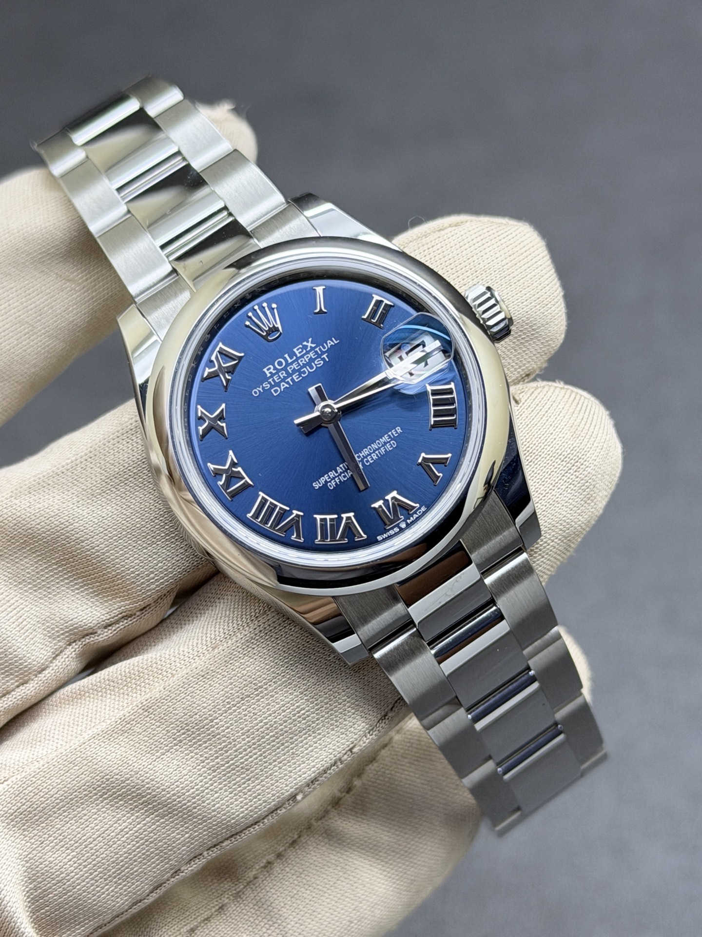 劳力士278240-0017女装日志型,蓝罗马板带,31mm表径,全套未使用品,公价62000,现好价。