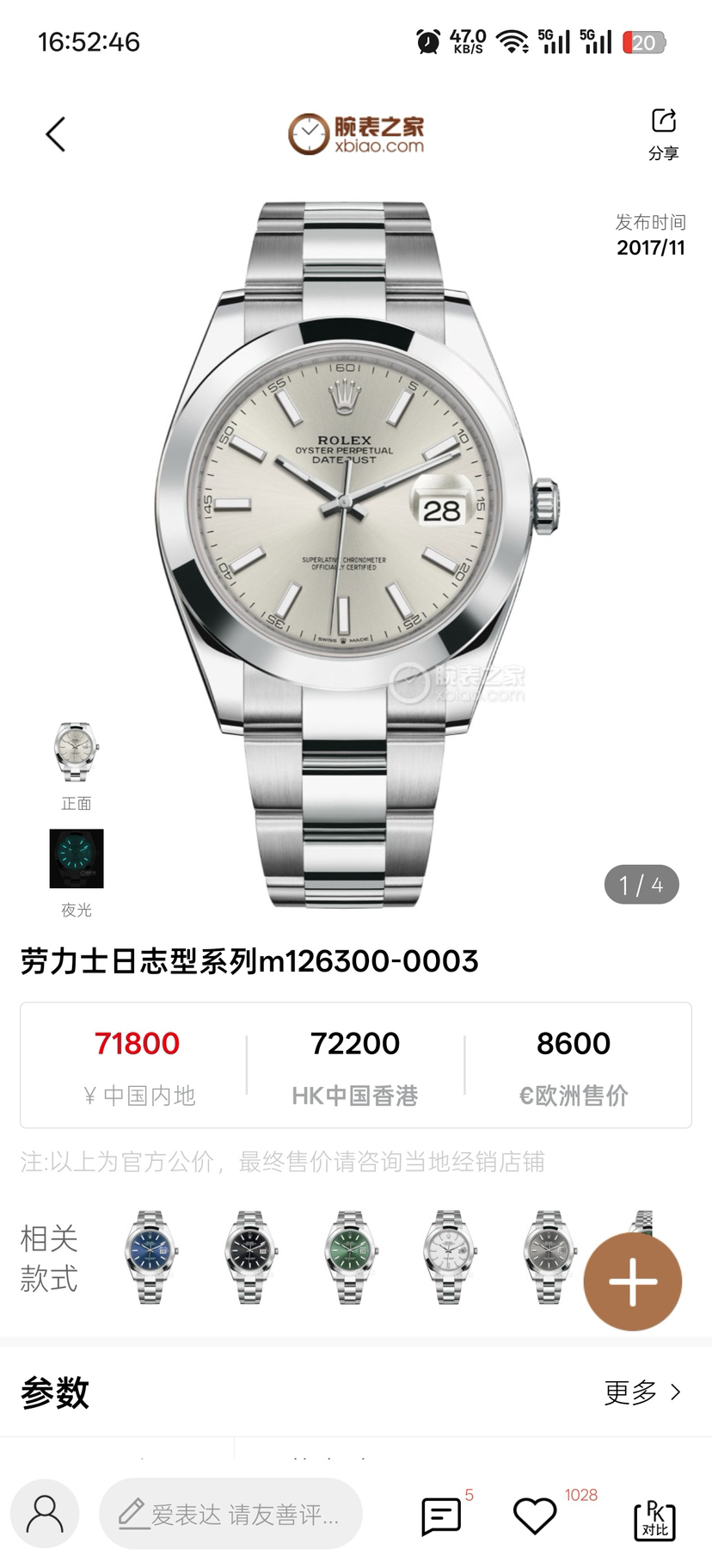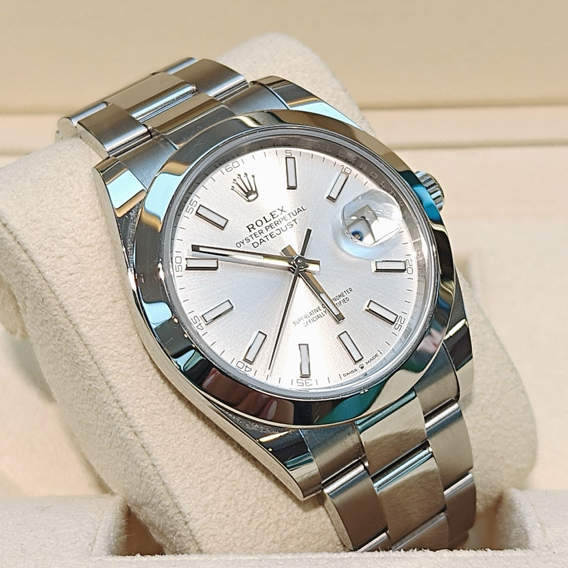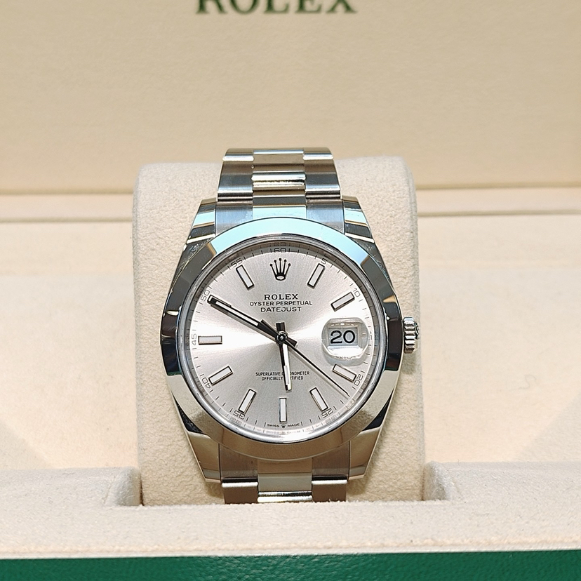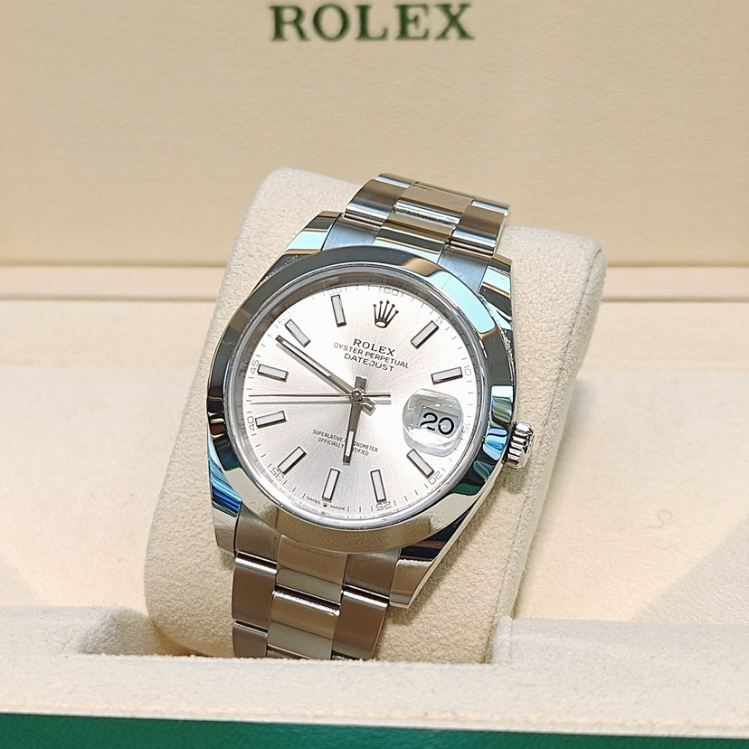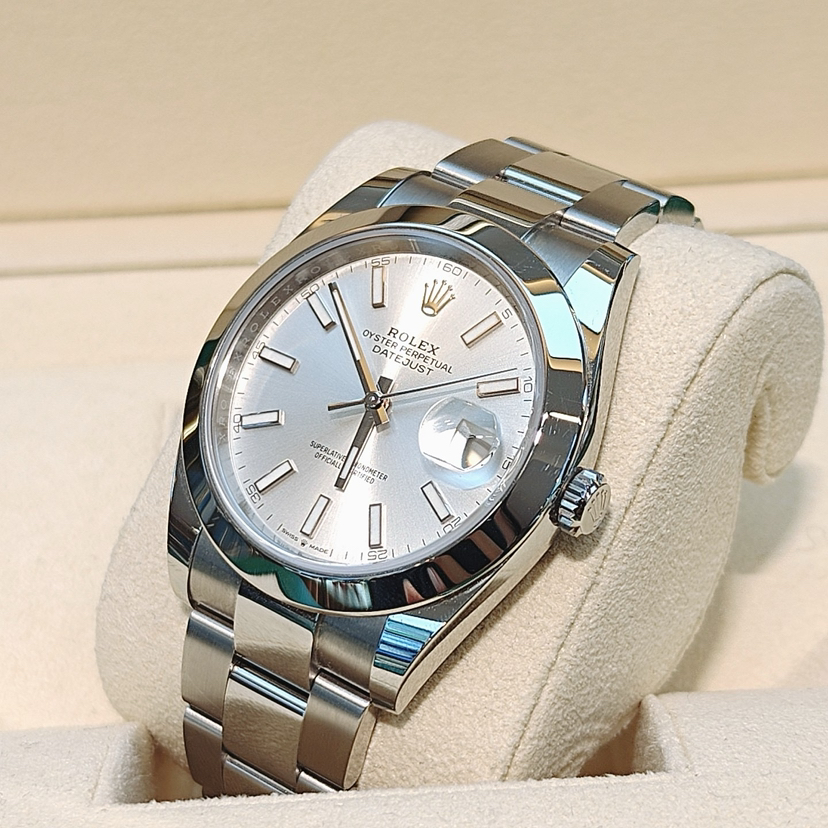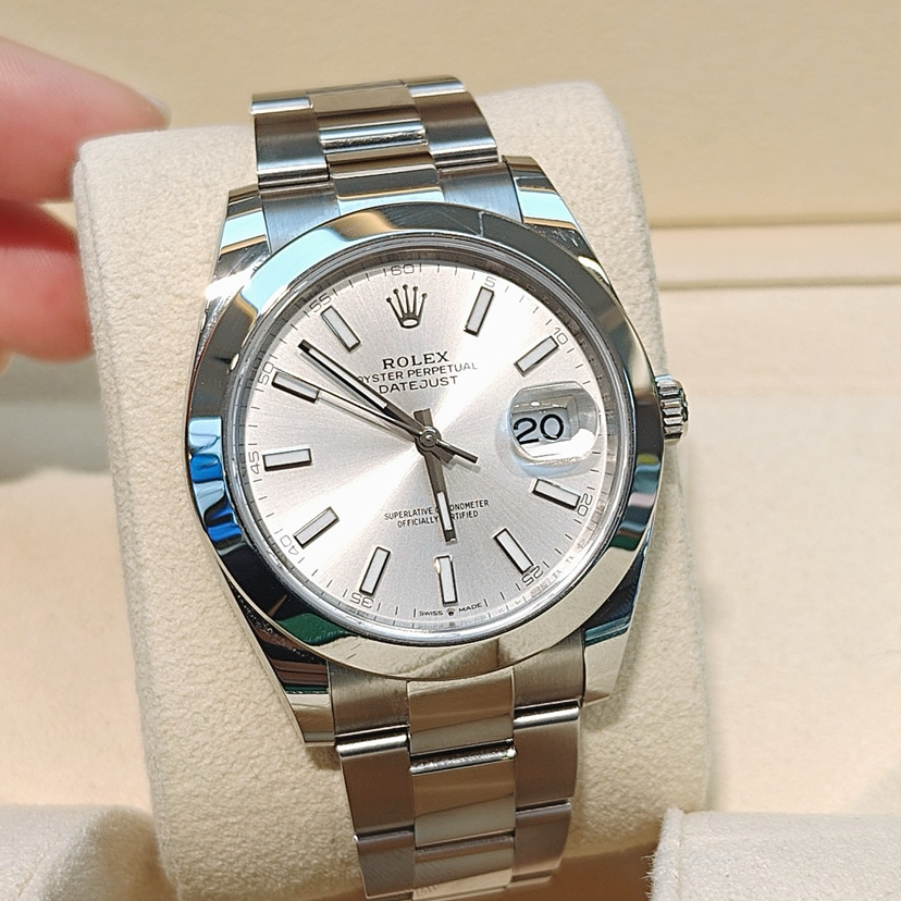 劳力士型号:m126300-0003男士腕表,不锈钢材质,自动机械机芯,41mm银色圆形表盘饰有棒状夜光时标和日历显示窗,折叠表扣,公价¥71800,现货好价。