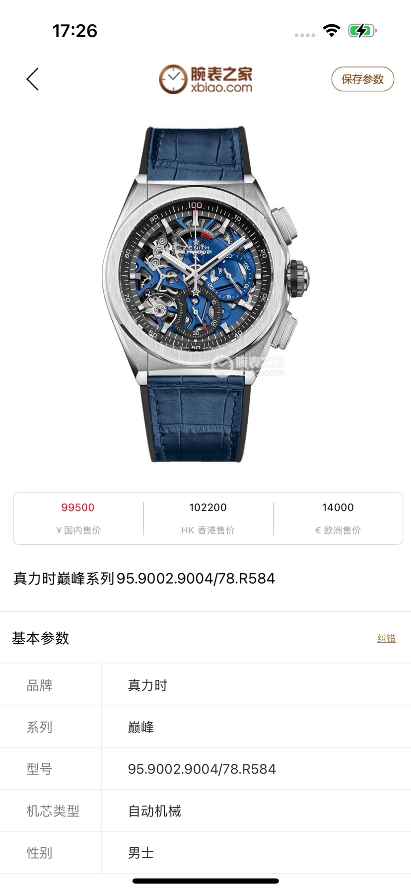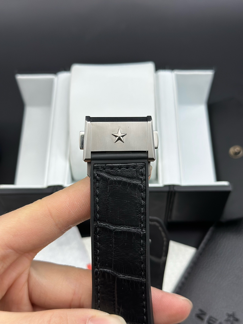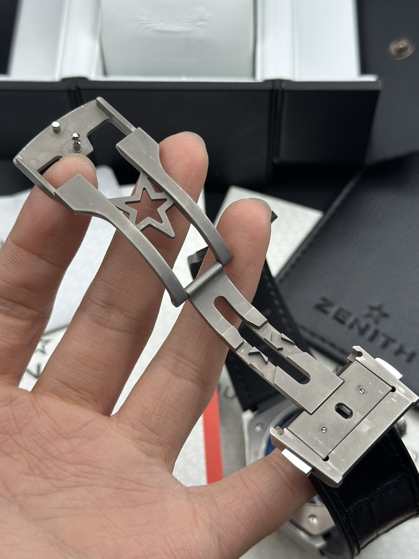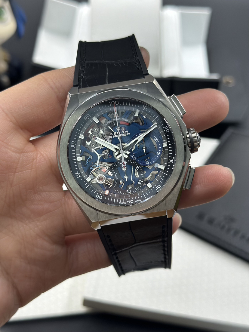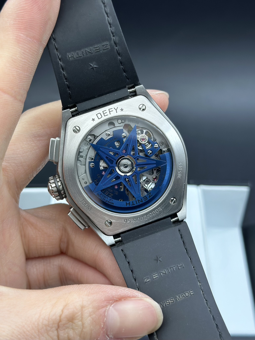 ZENITH/真力时 巅峰系列多功能计时男表,型号95.9002.9004/78.R584,镂空的烤蓝盘面视觉层次感强烈,机芯双发条,计时动力独立控制,计时功能开启1秒一圈!这非常zenith!钛金属表壳与表扣,双面透镜镂空设计,真力时家当家高频计时机芯,表直径44mm,2019年便携盒全套附件如图!极品成色98新 ,专柜售价99500。现货特价带走!。
