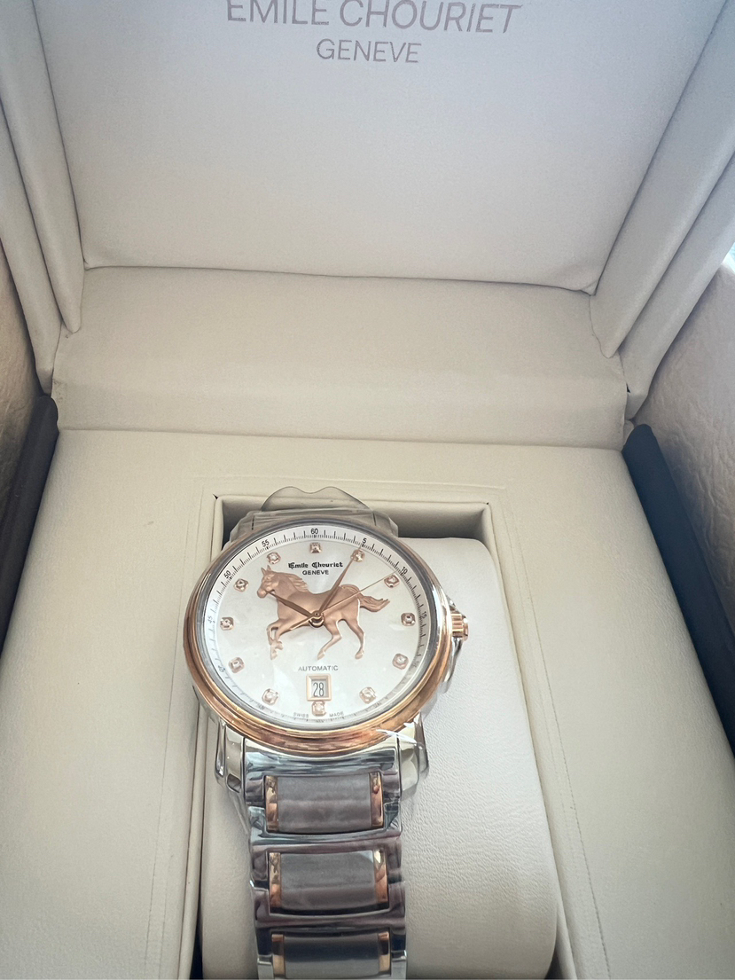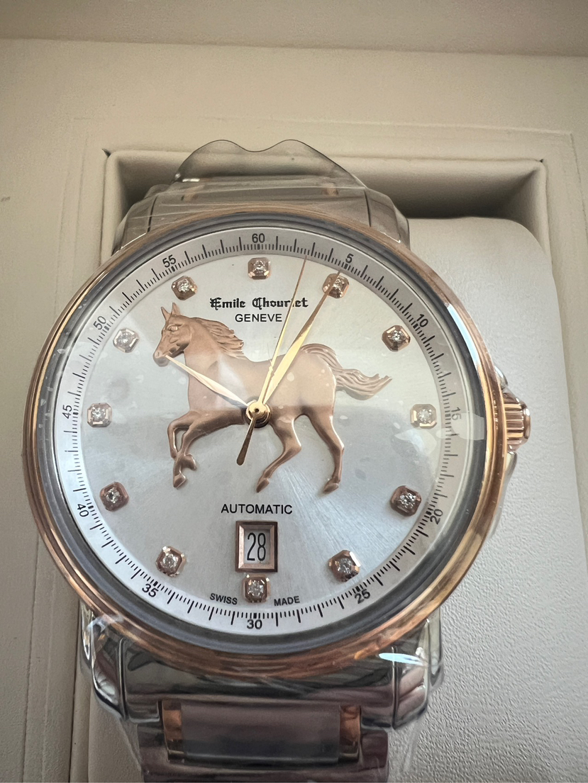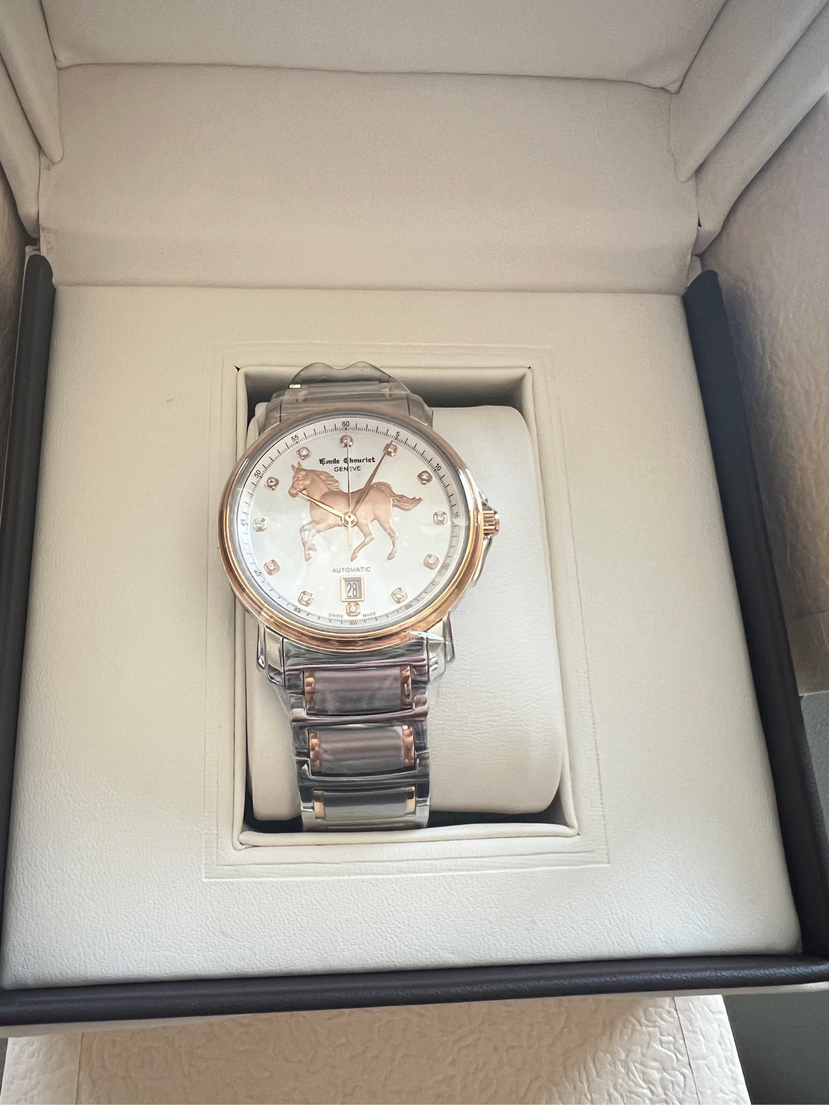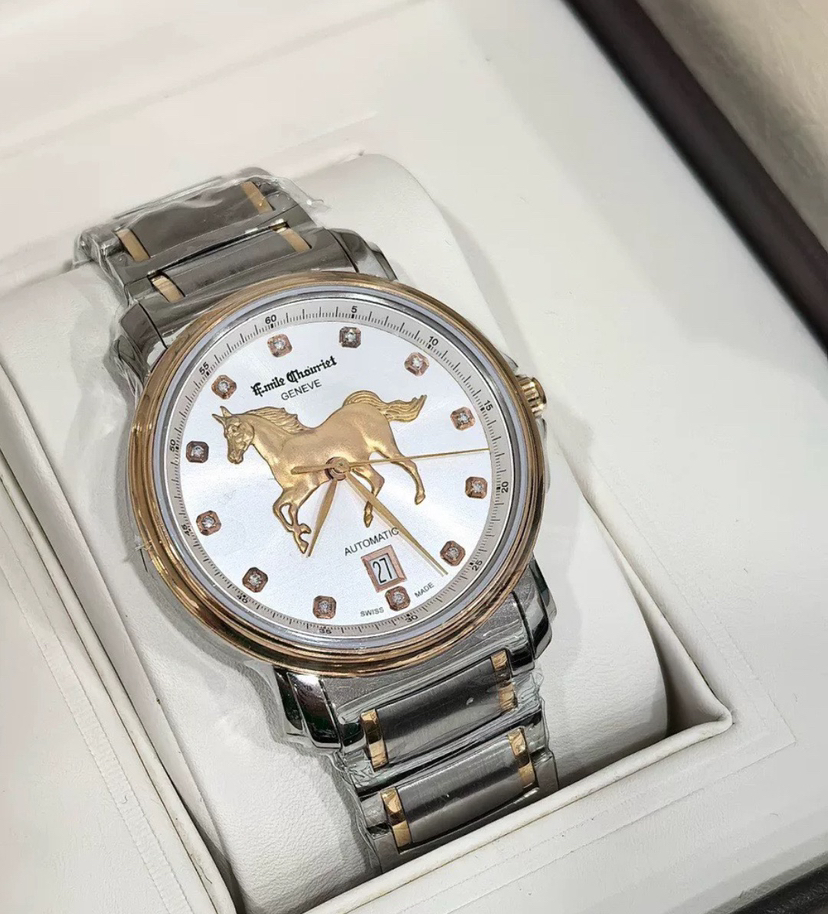 全新全套25年艾米龙莱蒙系列08.1168.G39.6.4.2H.1表圈表盘金色部分18k金,表带包金,钻石刻度,龙马精神步步高,限量款带编号,表头39mm。全自动机芯。带票25年全新全套,送长辈,送领导必备,吊牌在,价格3万多,现货好价